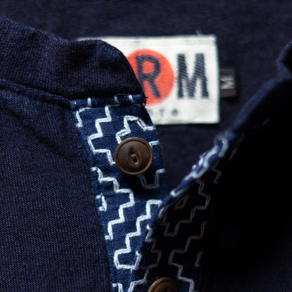 The sashiko patchwork on the sleeves, chest pocket, and placket adds a subtle touch of Japanese craftsmanship and elegance.