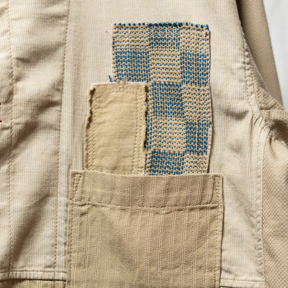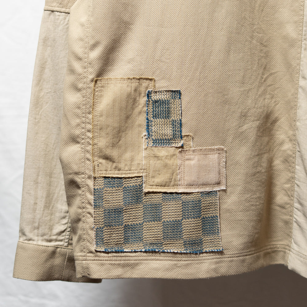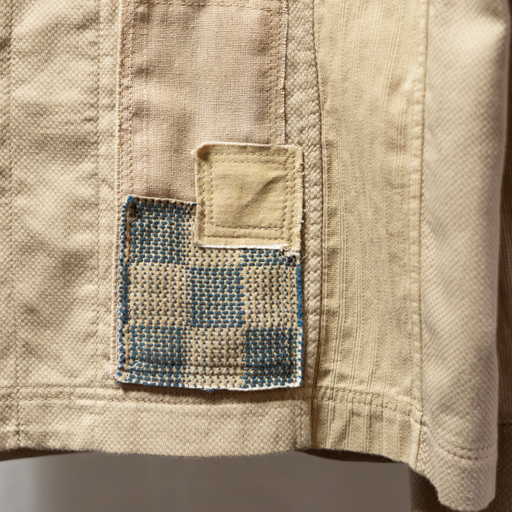 色々の形や柄の生地、それから大きさの違う布片を重ねたりはぎ合わせたりして、より変化に富んだ表情を生み出すパッチワークカバーオール。