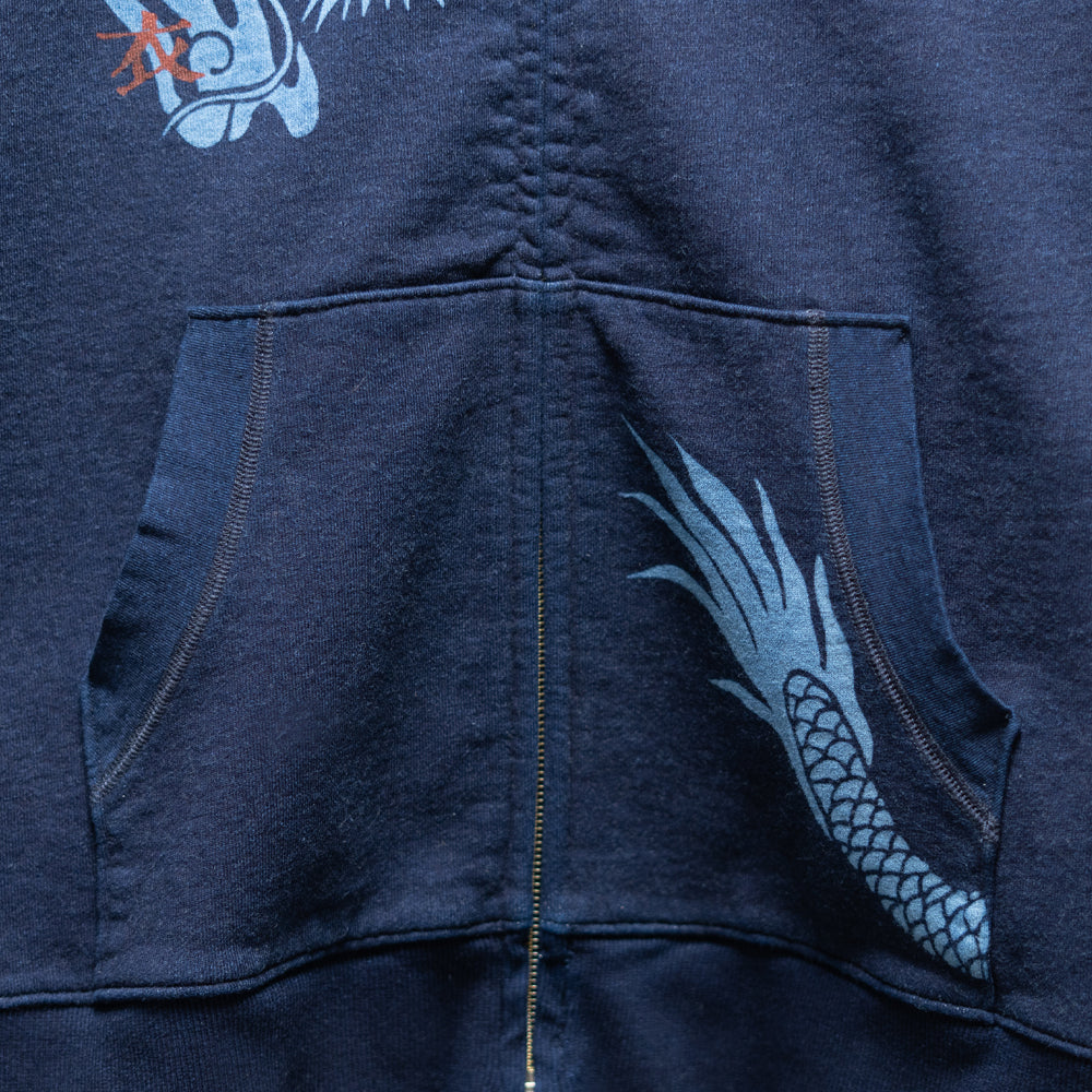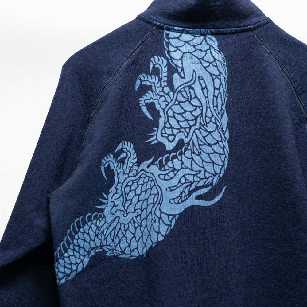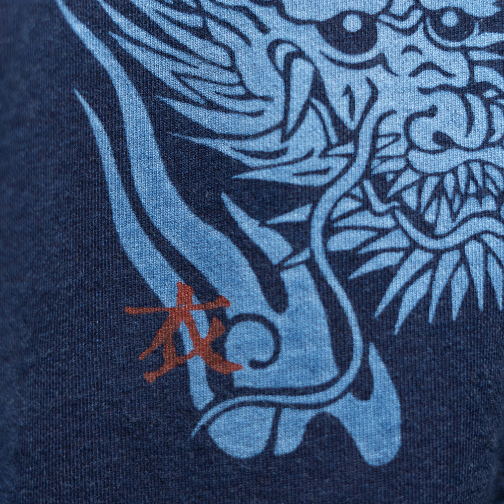 「抜染」という技法で、胸元・ポケット・背中と縦横無尽に駆け巡る龍の姿を表現してみました。