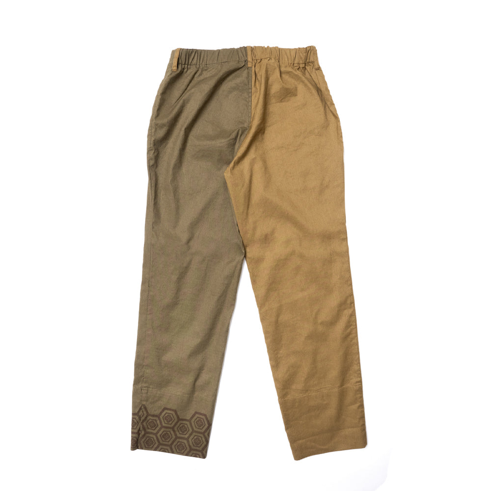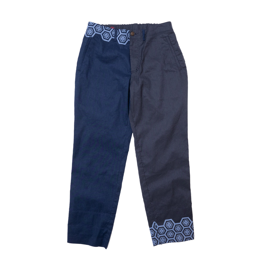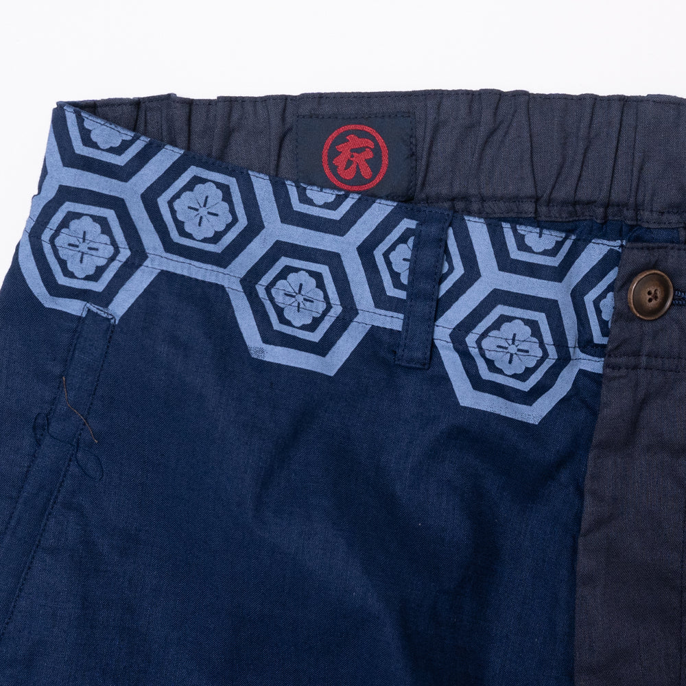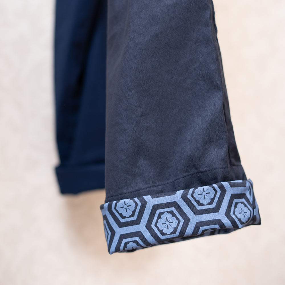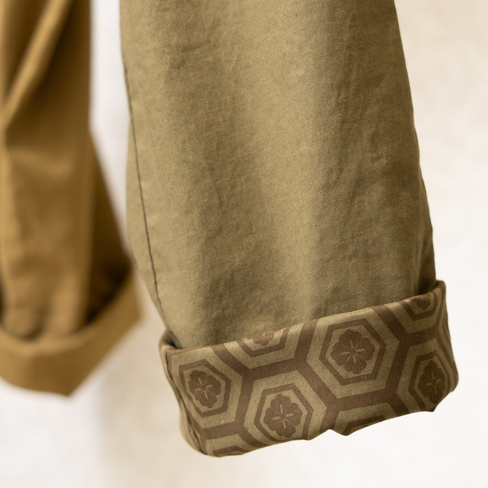 お洒落な人が支持しているのが裾のロールアップですが、手品の様に裾をめくると 、正六角形を繫げた亀甲文様の中に花菱を配した、シンプルな品のいい文様が巡り出てきます。