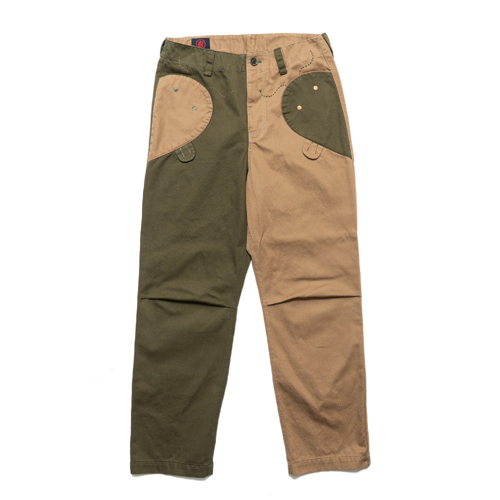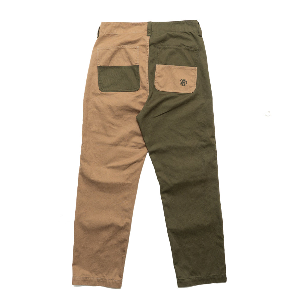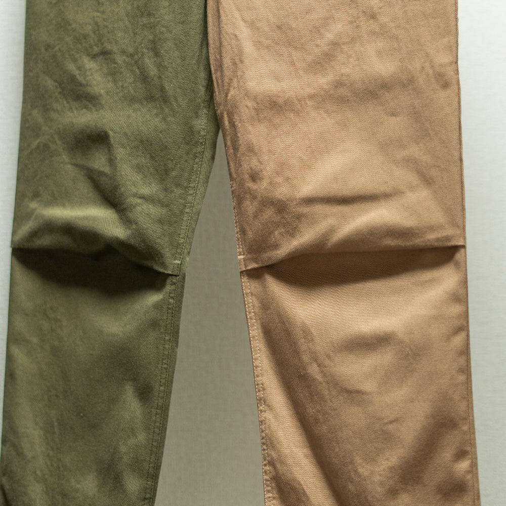 左右で互い違いに組み合わせた生地色が、一筋縄ではいかいない個性をプラスしたワークパンツです。