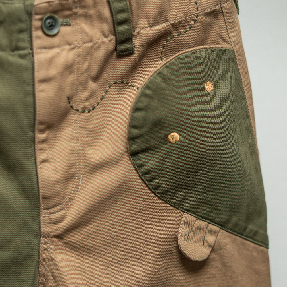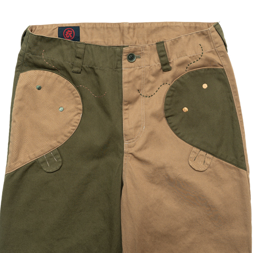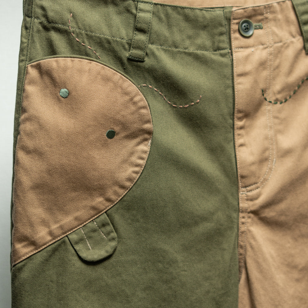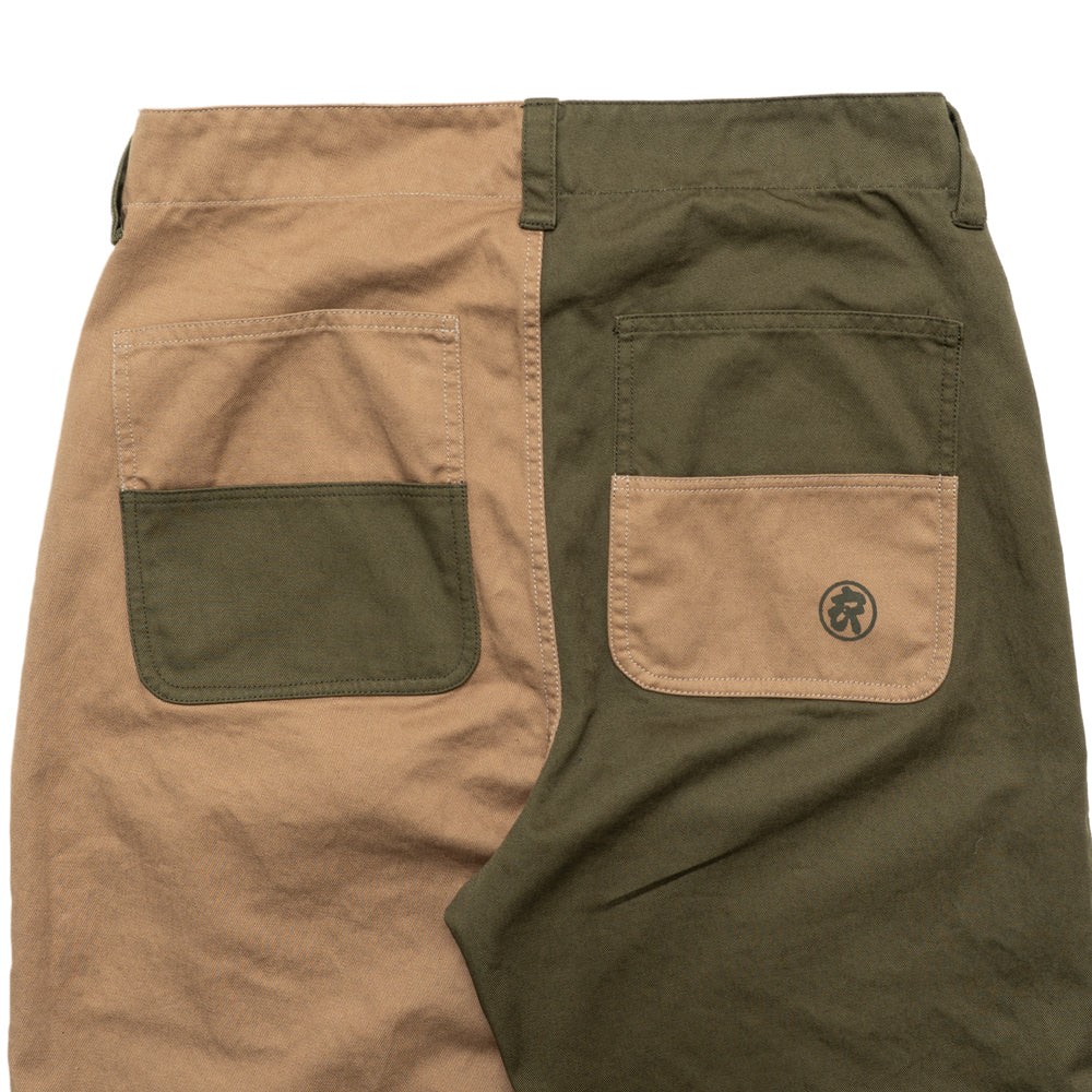 左右で互い違いに組み合わせた生地色が、一筋縄ではいかいない個性をプラスしたワークパンツです。