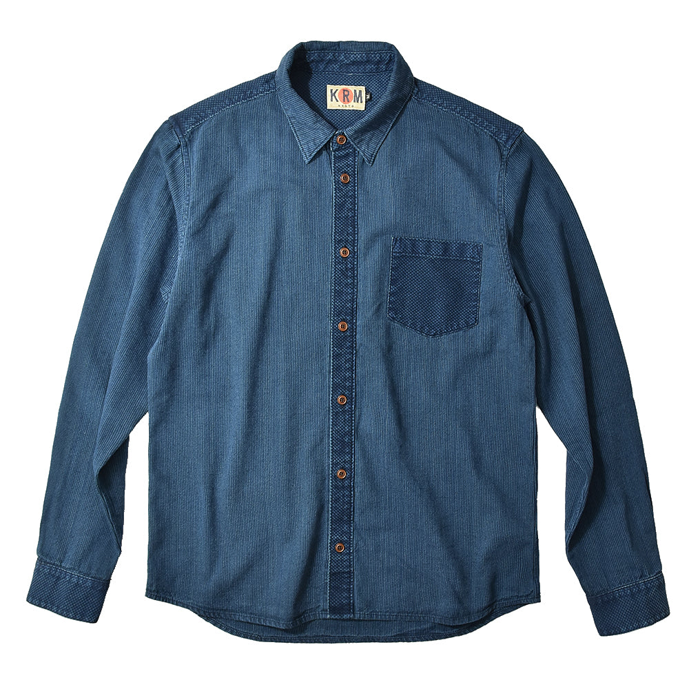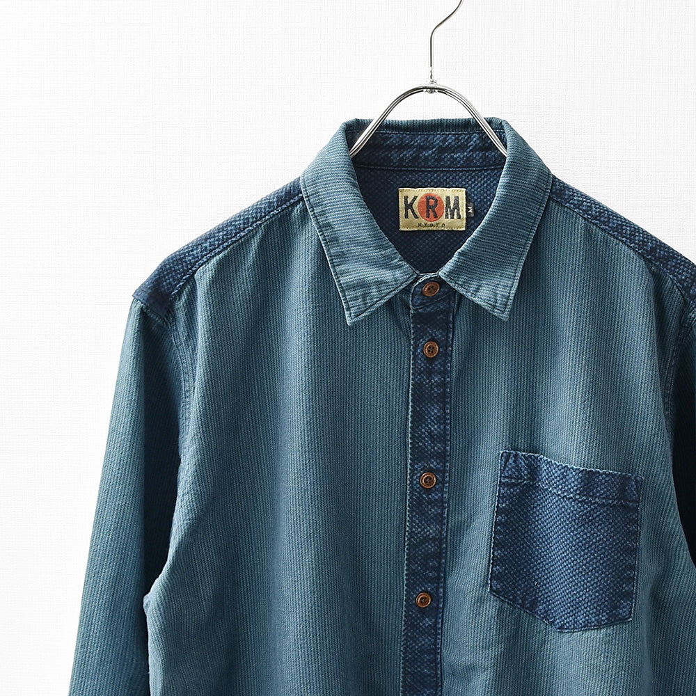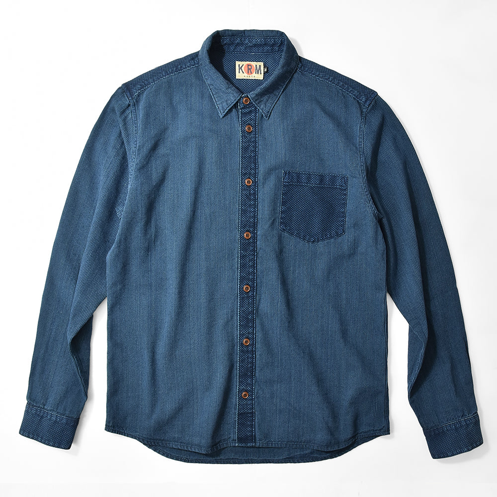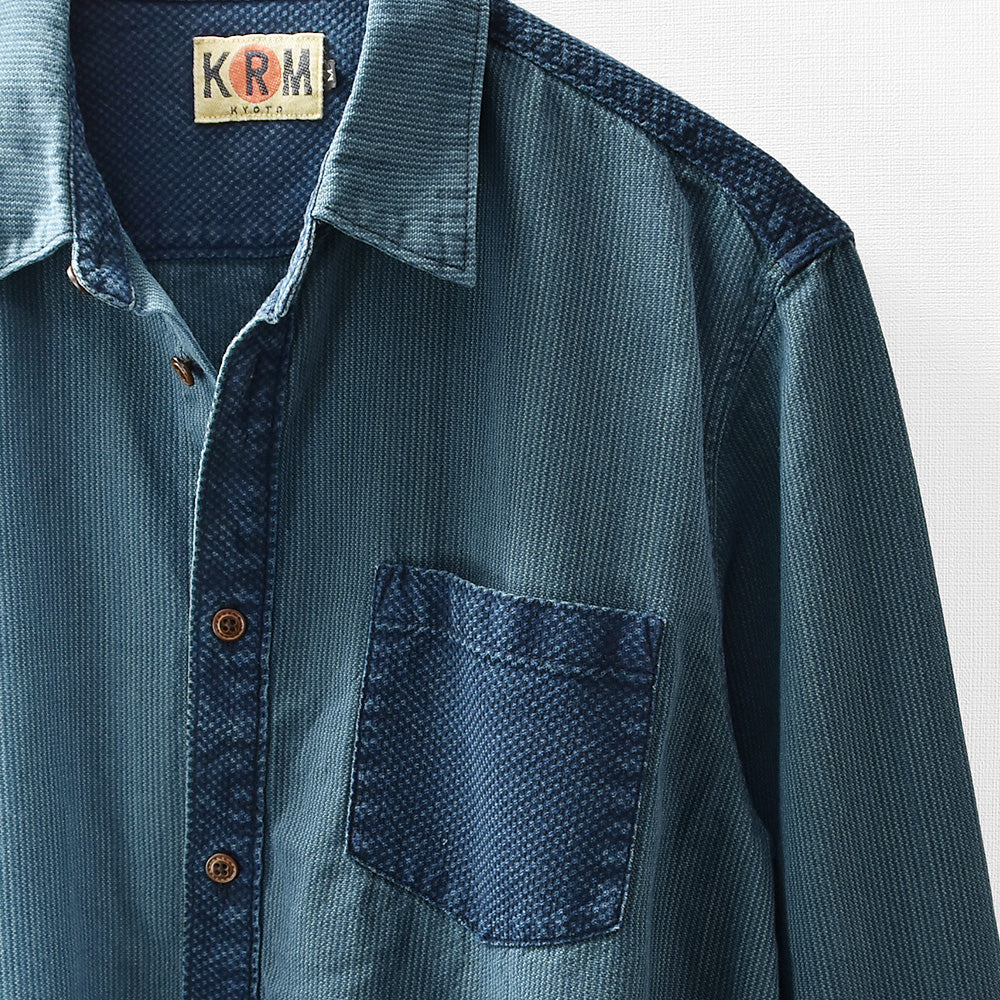 メインの、ストライプ生地と切り替えで使われた刺し子生地が、カフス、バックヨーク、前立て、さらにはポケット生地にとあしらわれ、また、牛革を思わせるボタンも良いアクセントに。