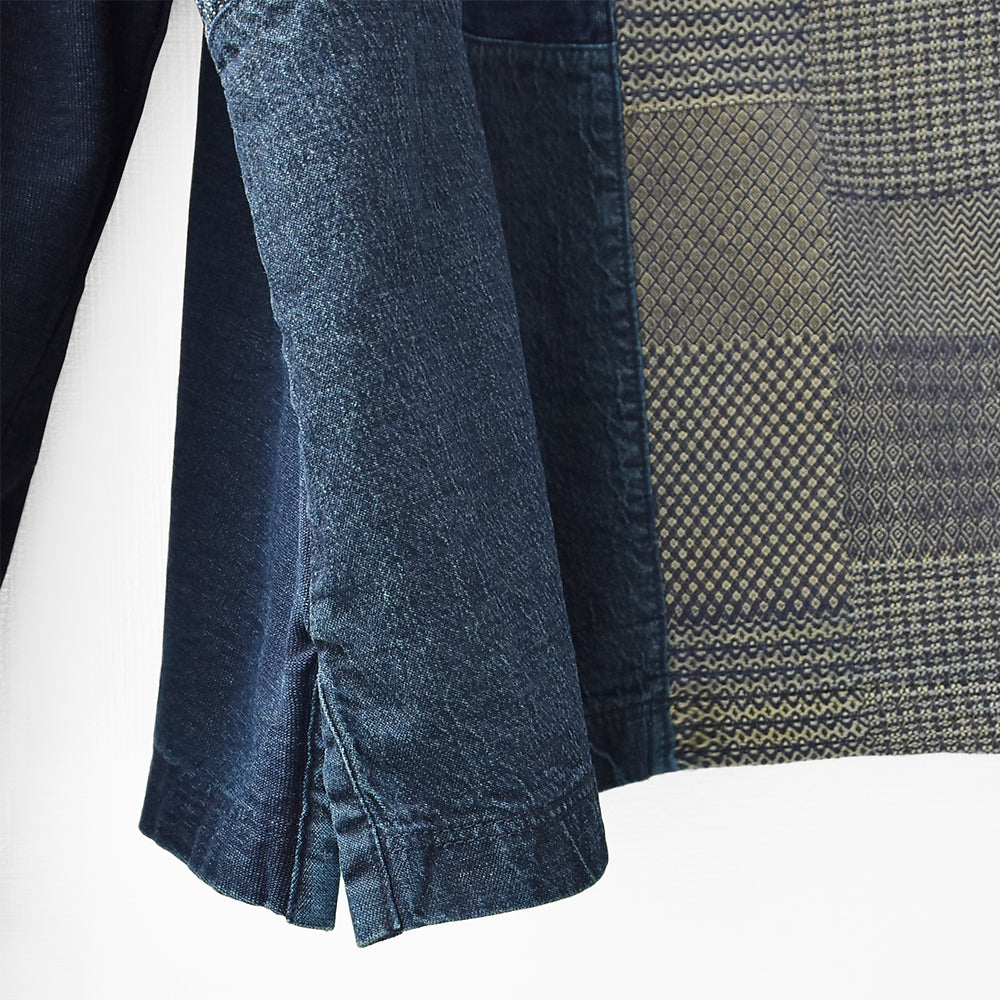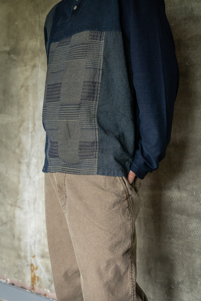 今回は、これまで製作された、様々な生地を贅沢にパッチワーク使いし、ゆったり目なサイズ感のプルオーバーのようなシルエットで製作いたしました。