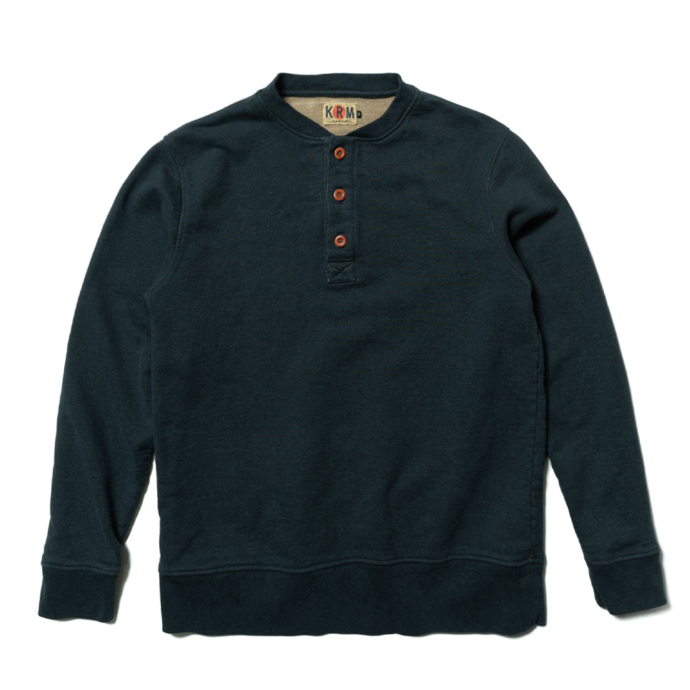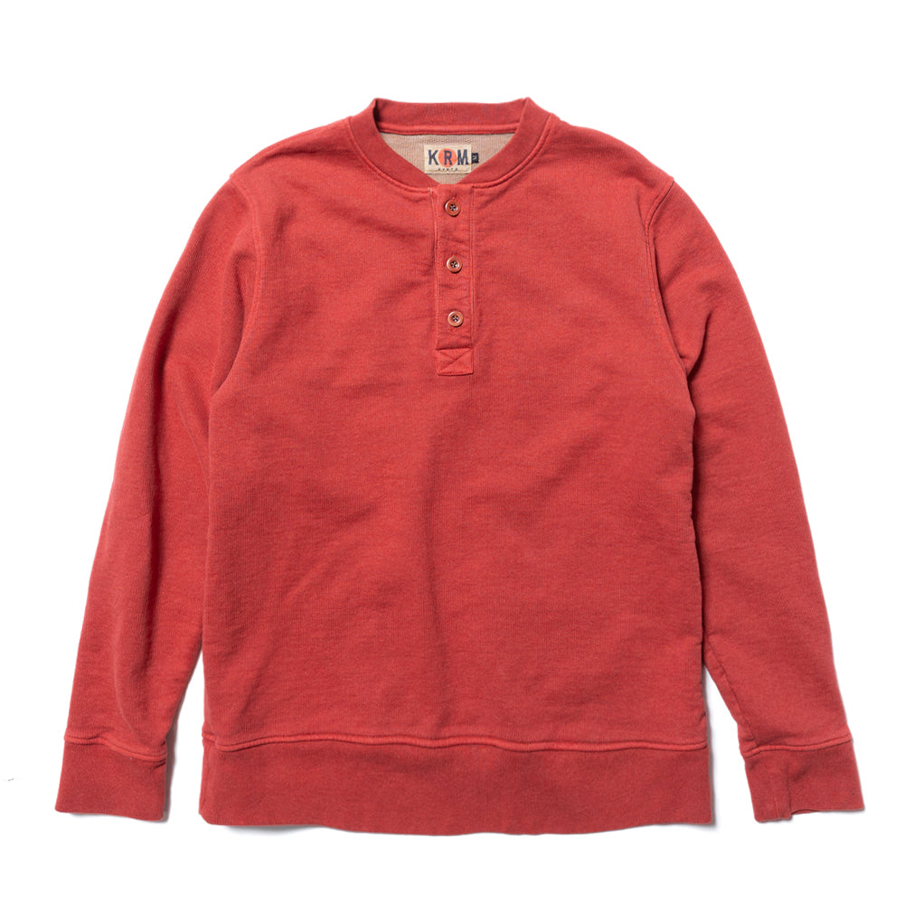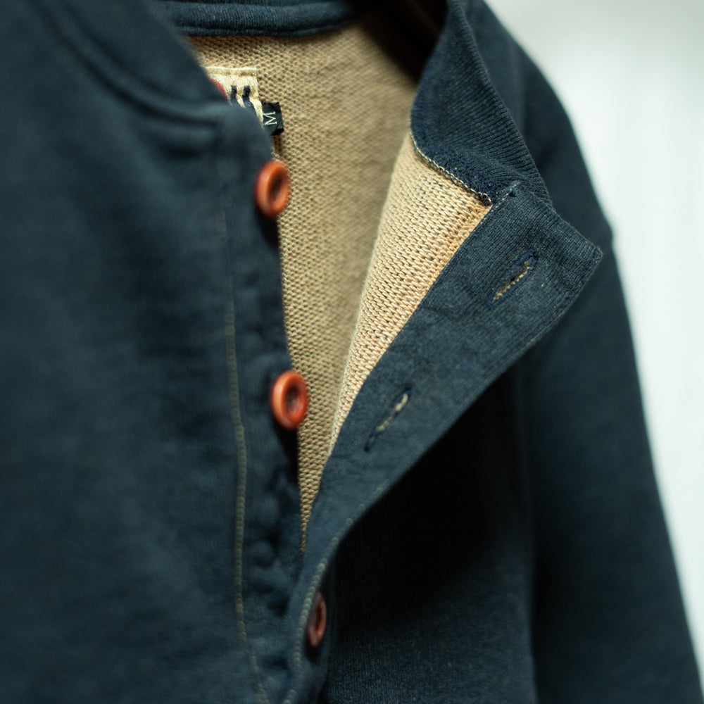 ヘンリーネック仕様なので、ボタンダウンシャツを差し込みスウェットのボタンを一つ開けて見せる、そんなレイヤードもお勧めです。