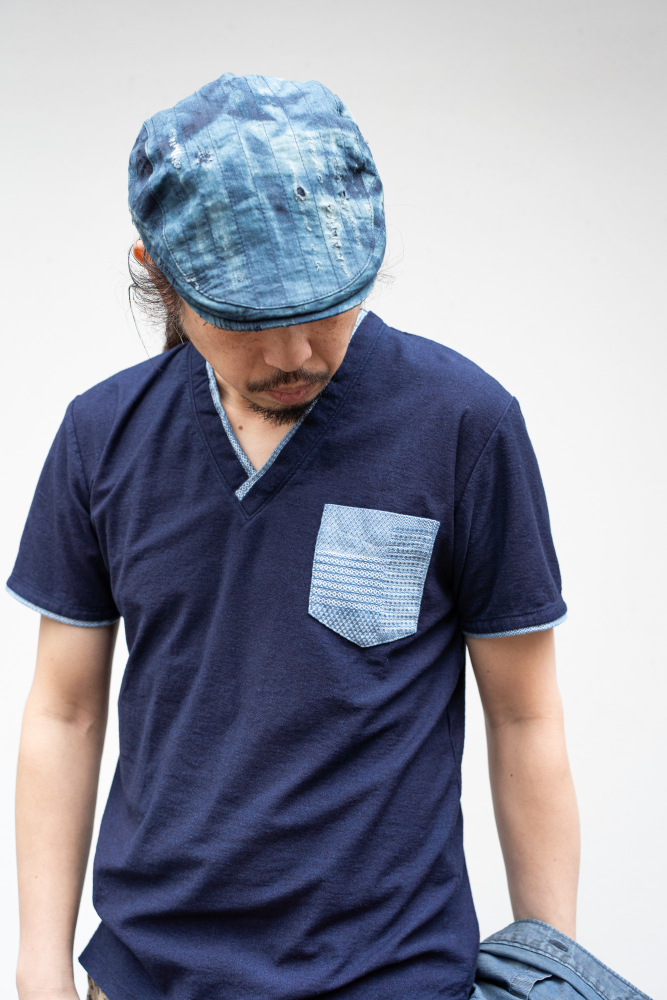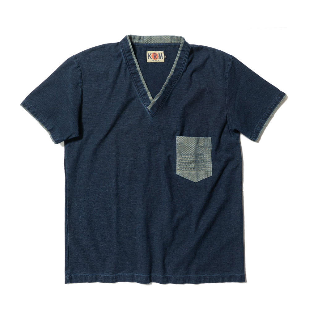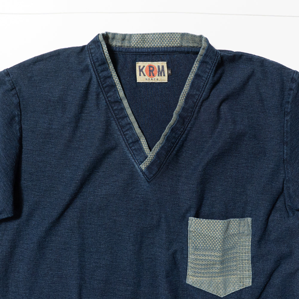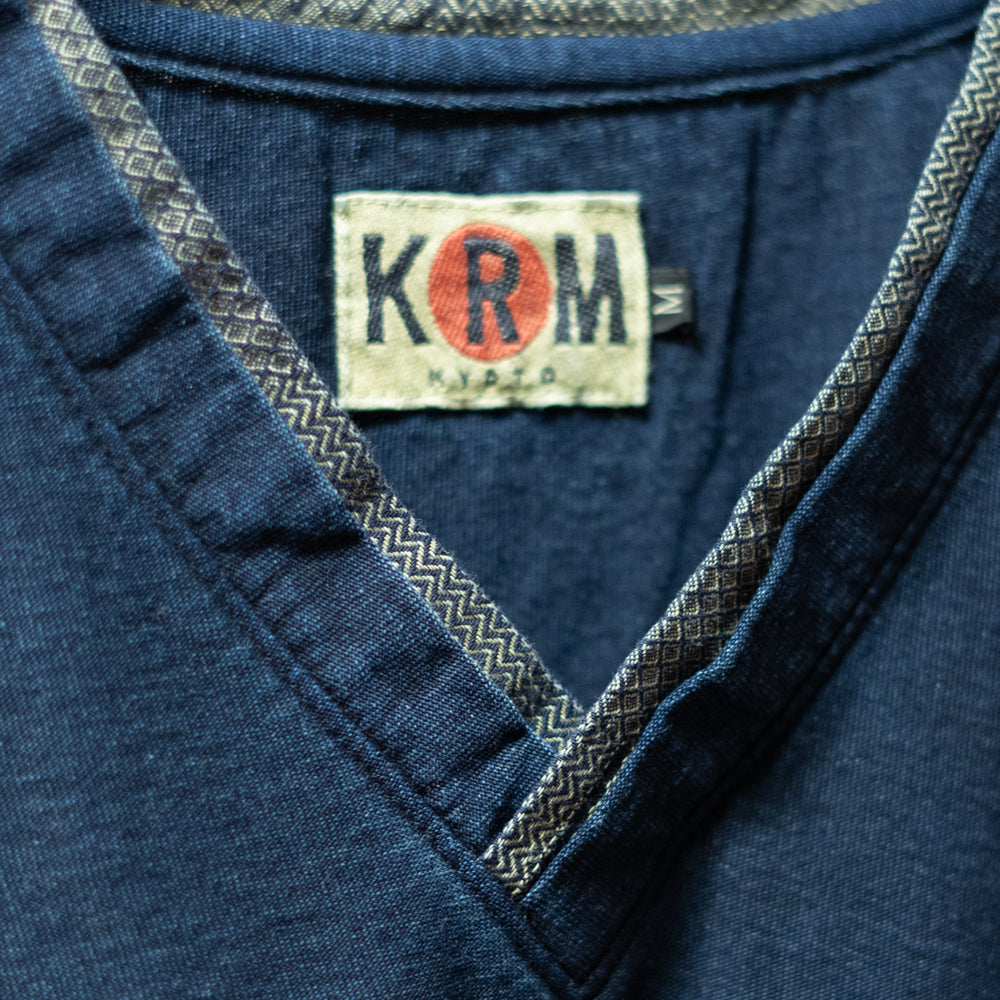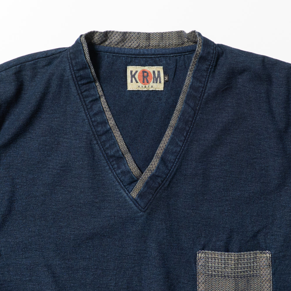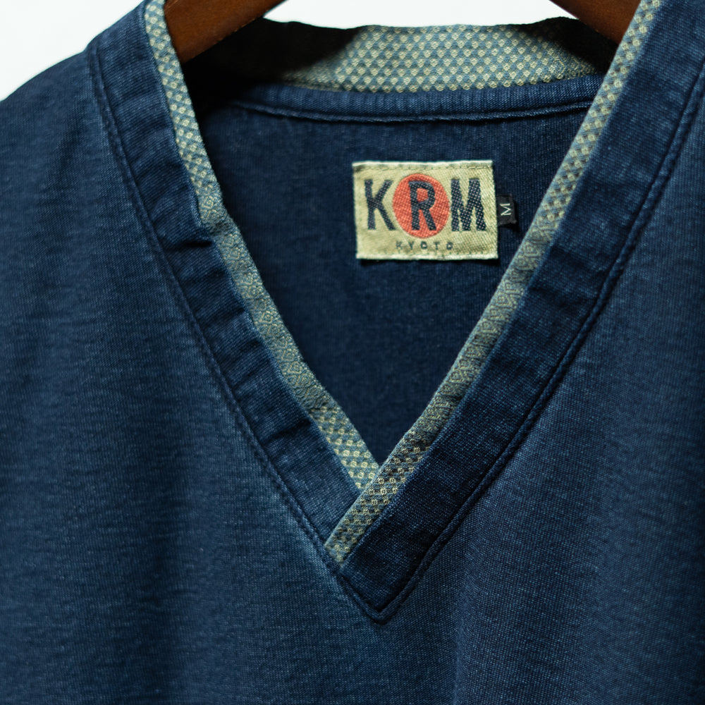 定番のインディゴ撚糸生地で製作された、今年のKRMブランドの一作目となるカットソーは、打ち合いの衿元を模したVネック、その名も“着物衿”を採用した和を感じさせる一着。