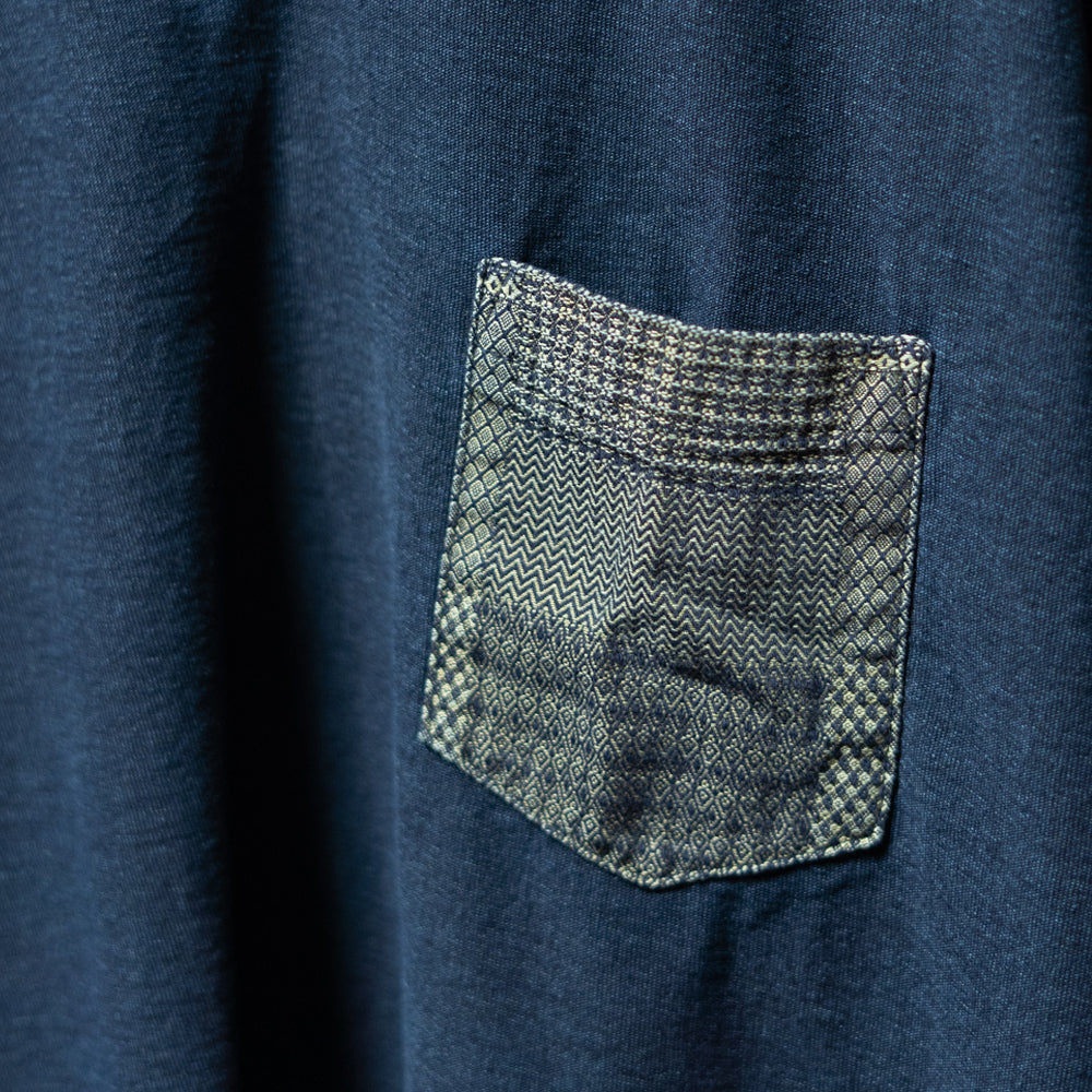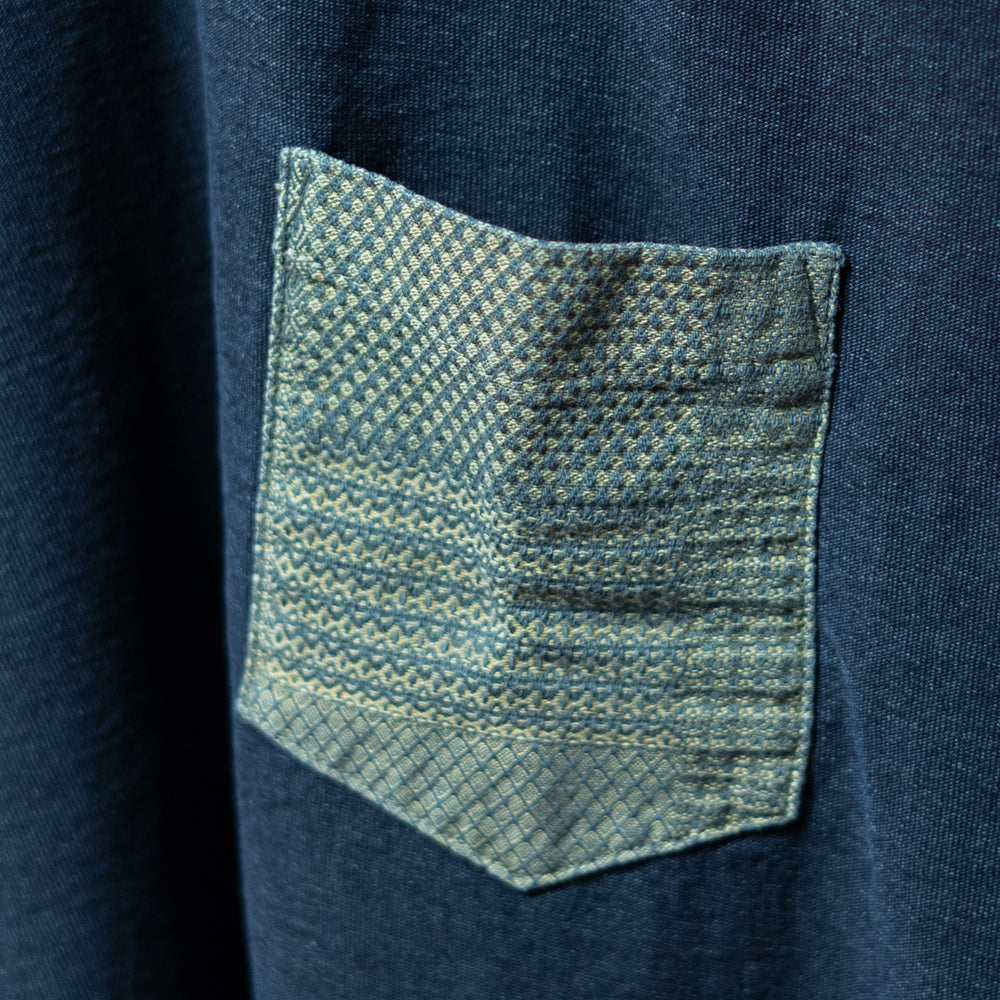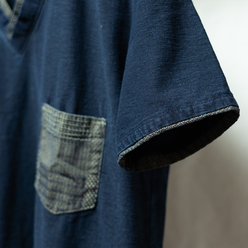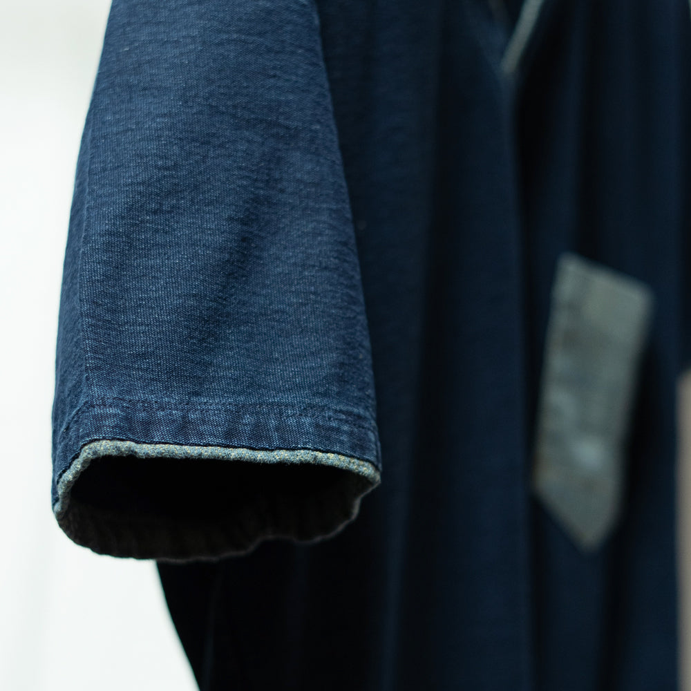 Vネックのラインと共に、袖口にも同様の生地を挟み込むことで濃色なインディゴに軽やかな印象が加わります。