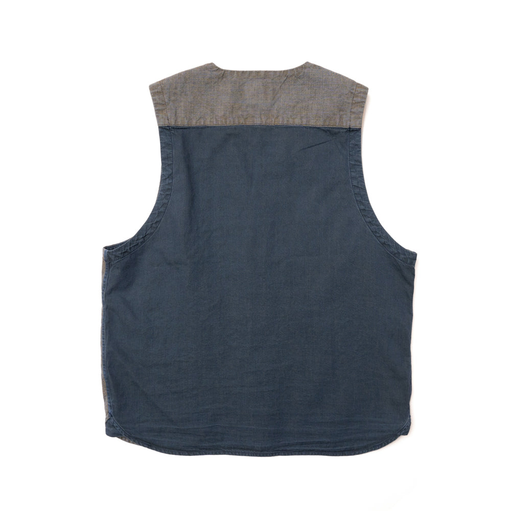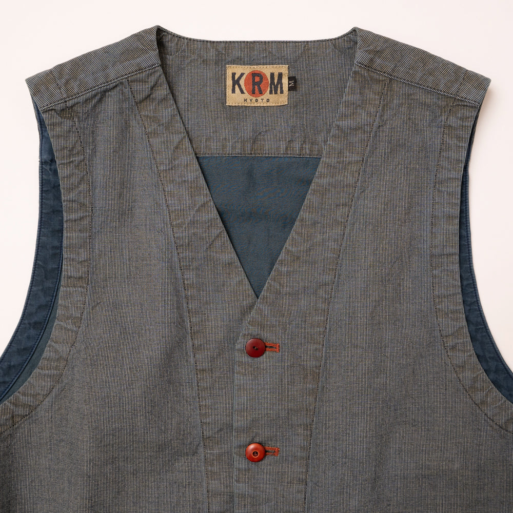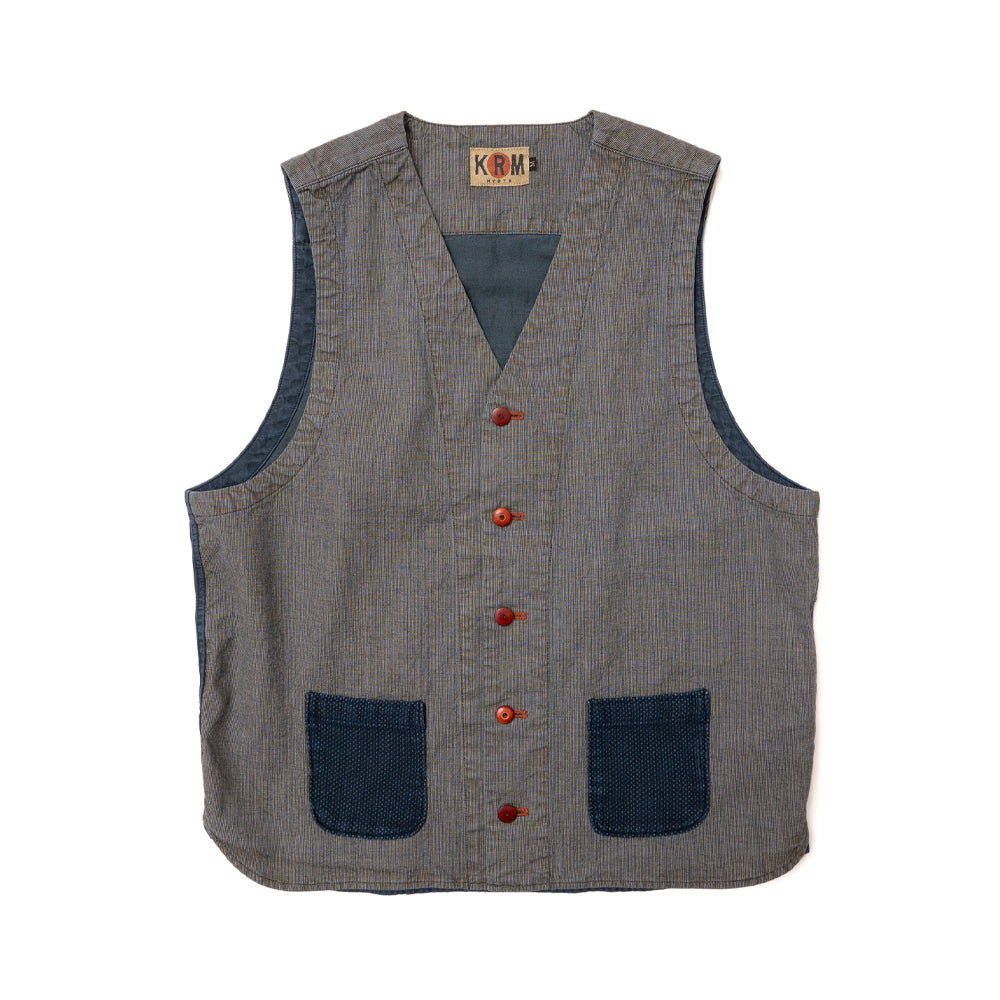 チェック生地をベースに、刺し子織のポケットを使用したVネックベスト。