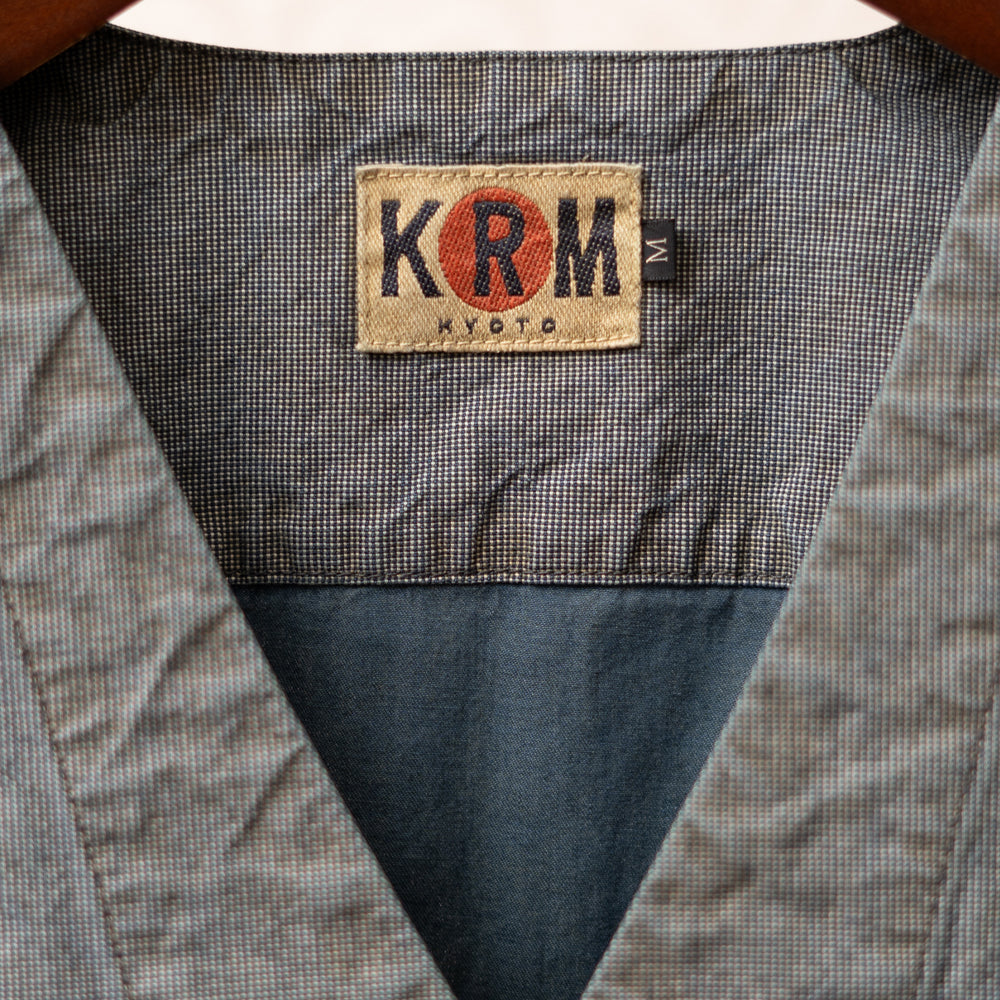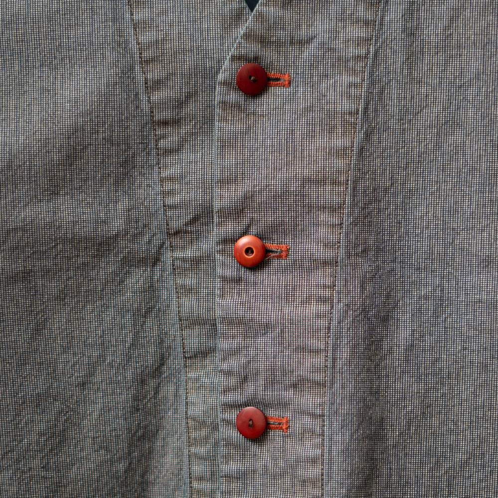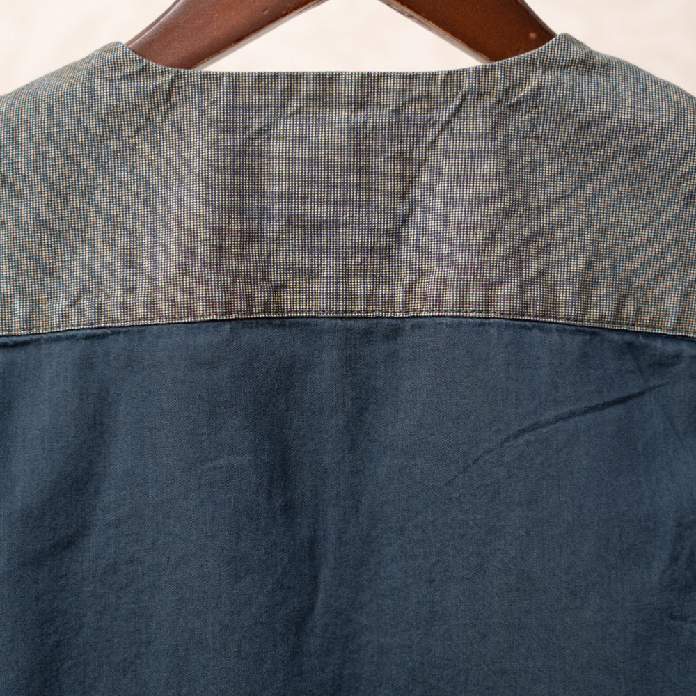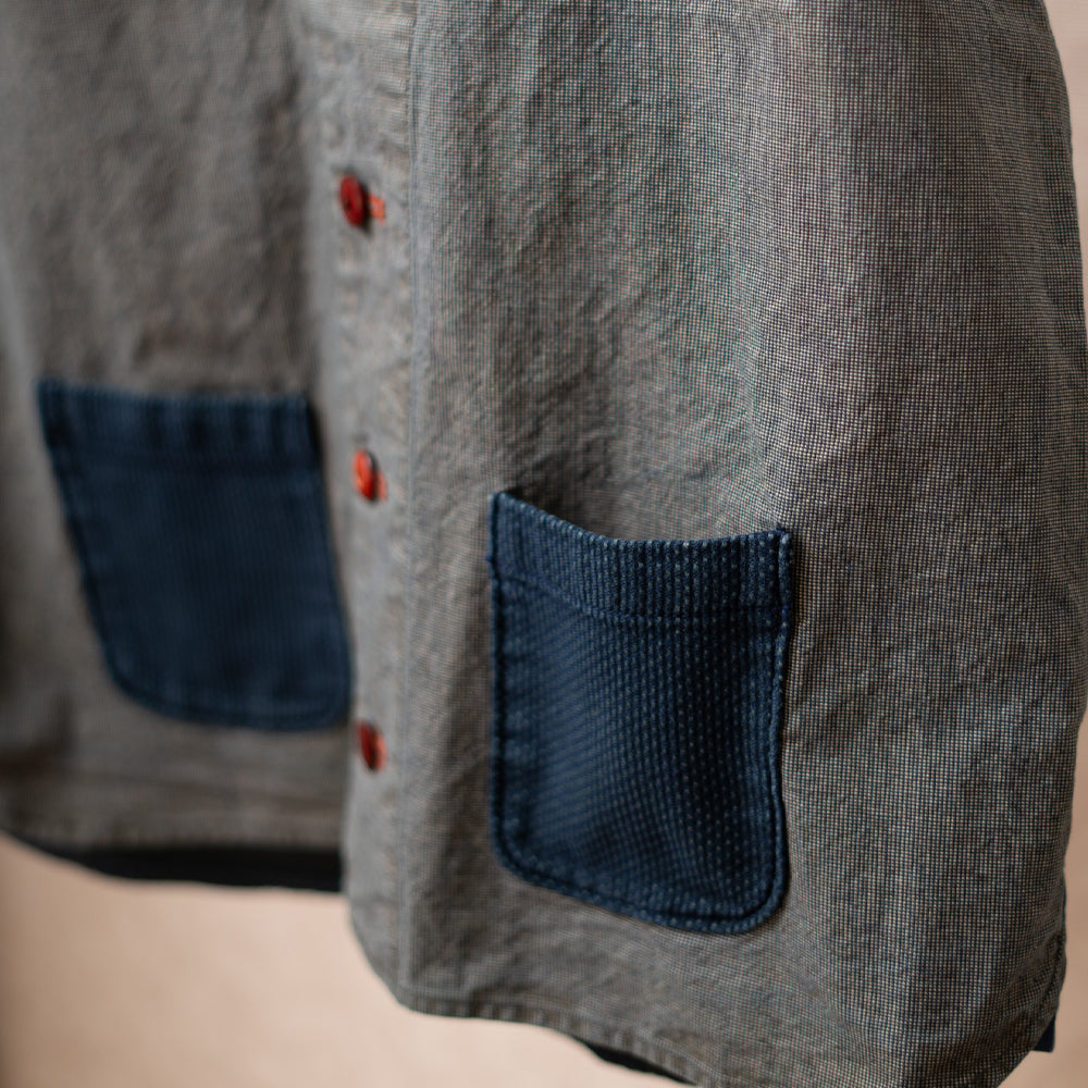 チェック生地をベースに、刺し子織のポケットを使用したVネックベスト。