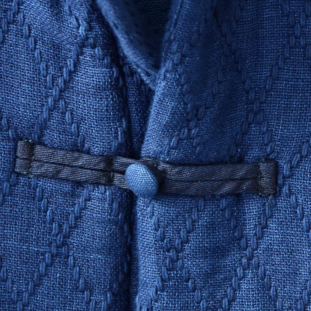 色の違う藍色を表と裏で重ね合わせ織り、ダイヤ刺し子の模様を作りながら太い糸で繋ぎ合わせて厚みを作り出してくれた素材です。