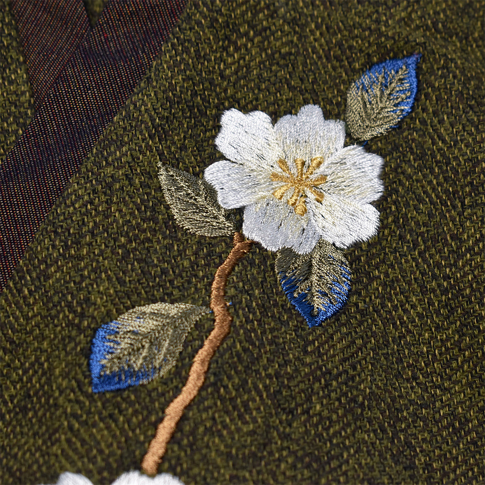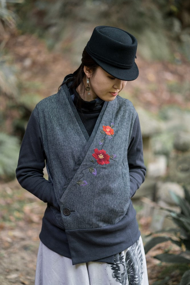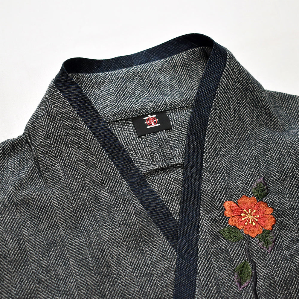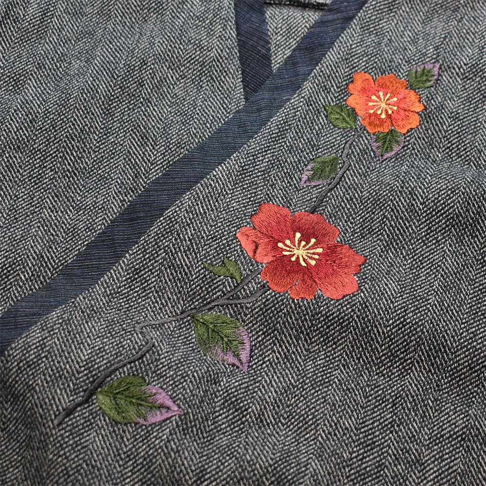 “手振り刺繍”による山茶花の花は存在感もあり、 着丈も少し長めで腰まわりもすっぽり覆ってくれますね。