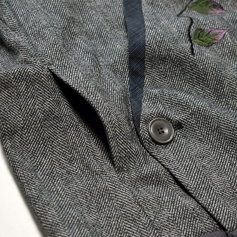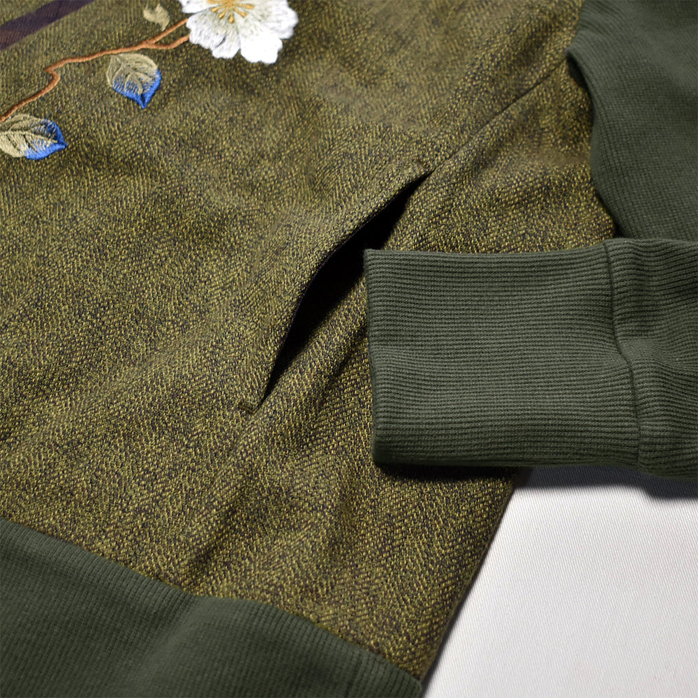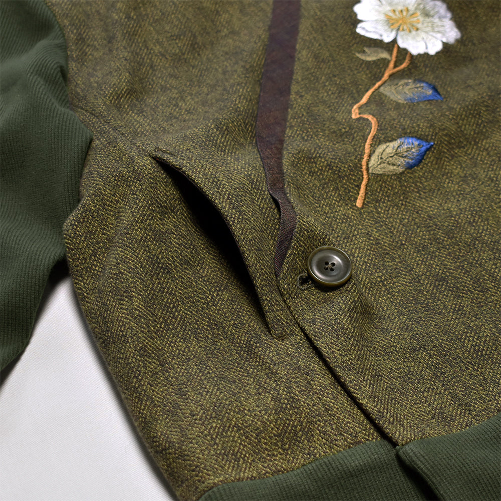 “手振り刺繍”による山茶花の花は存在感もあり、 着丈も少し長めで腰まわりもすっぽり覆ってくれますね。
