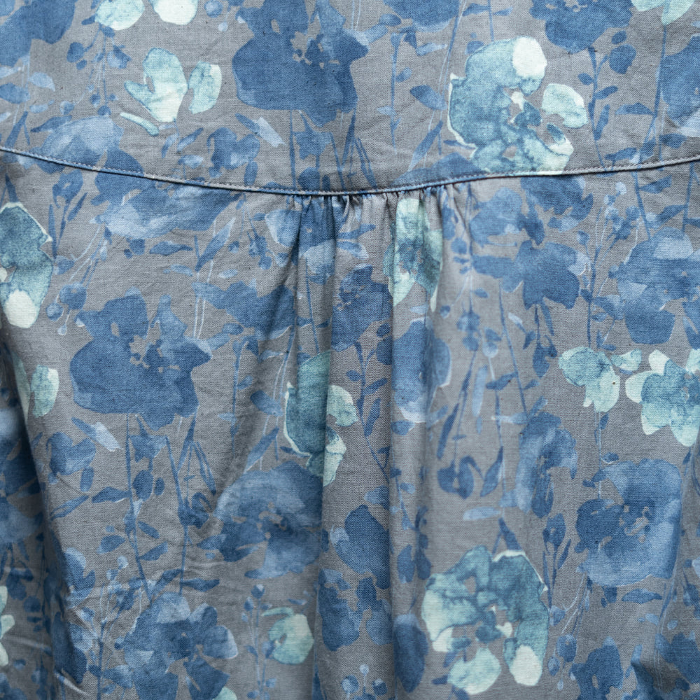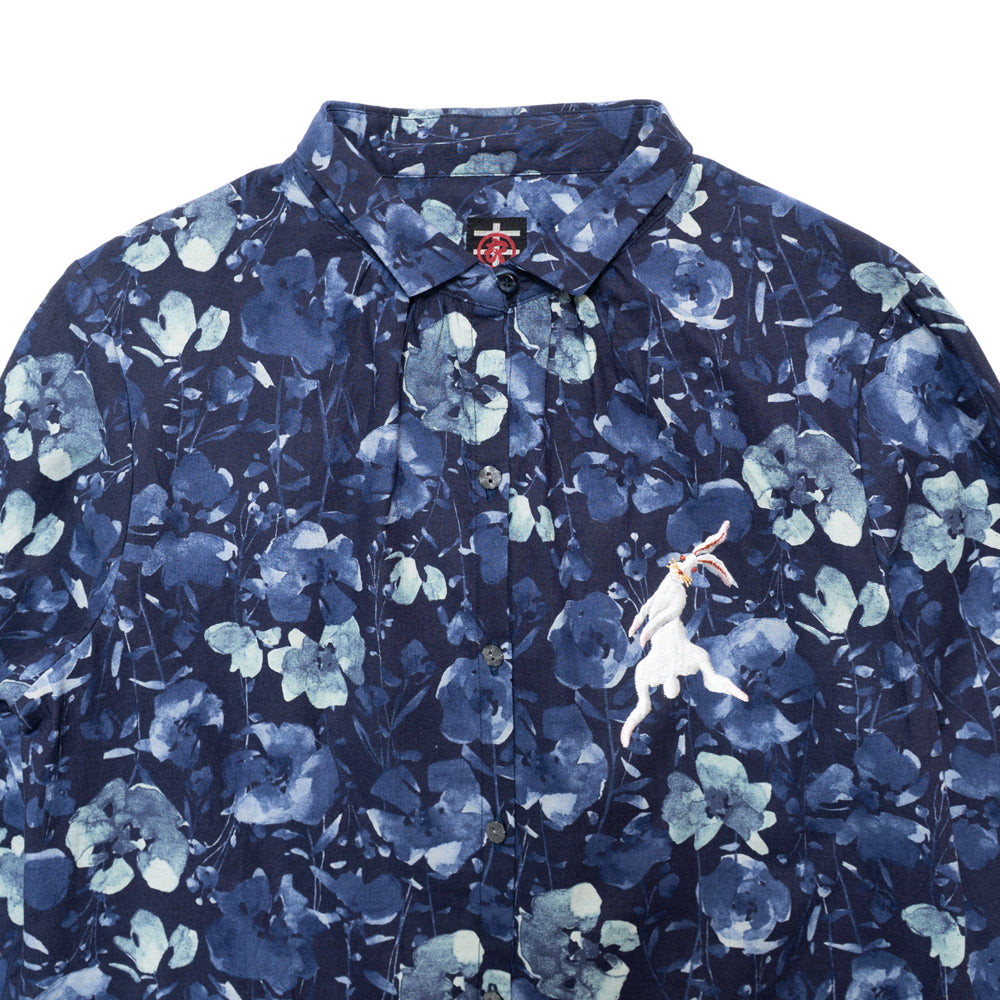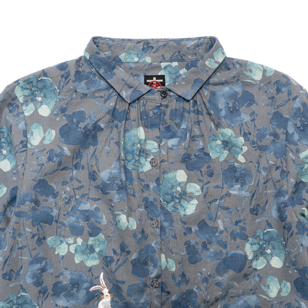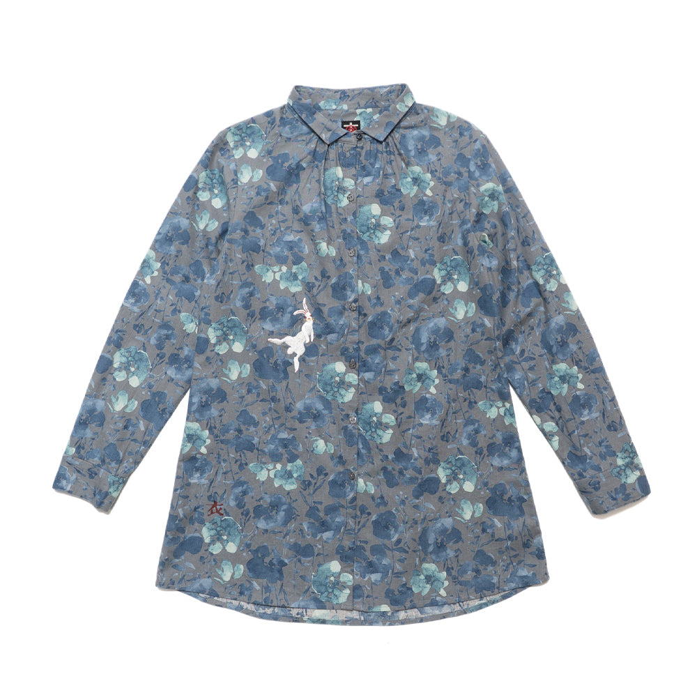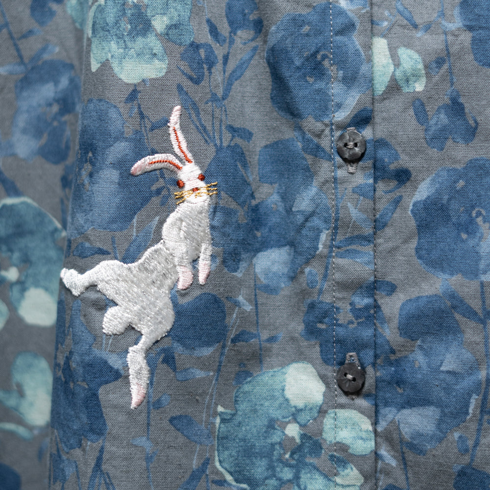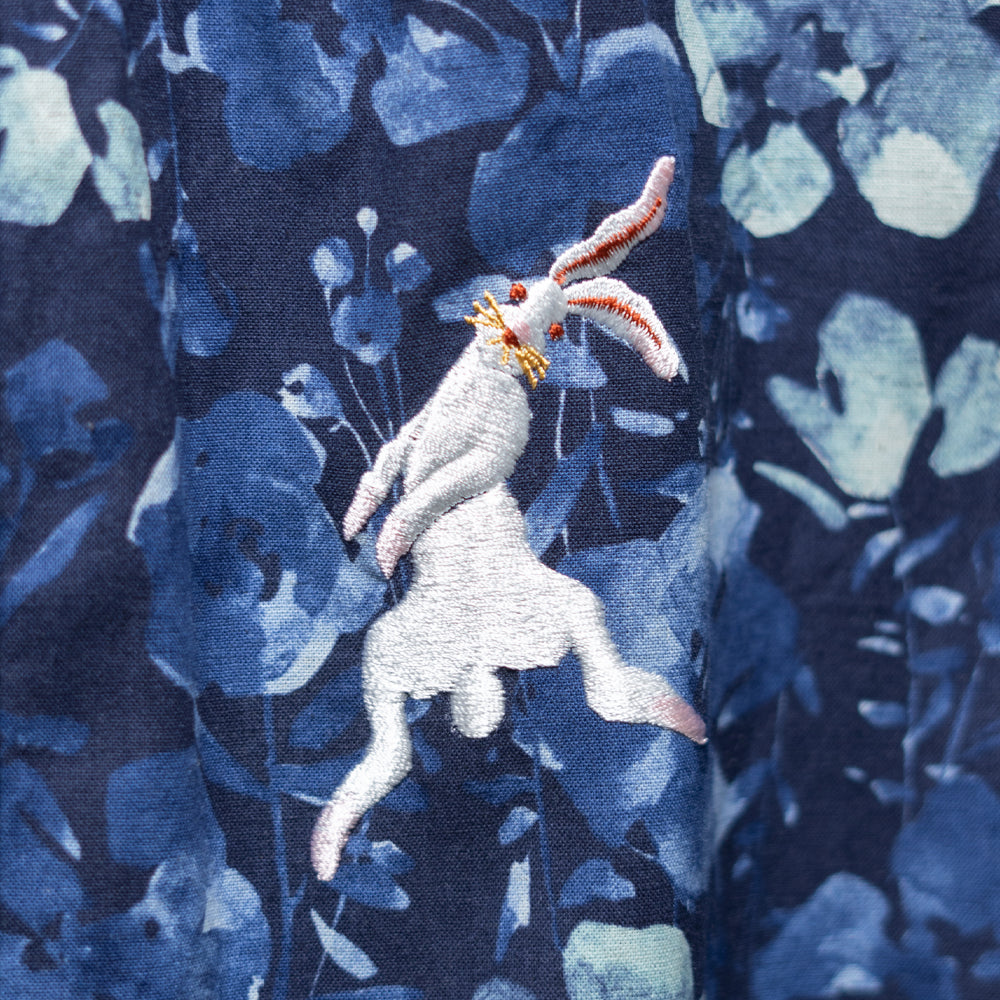柔らかな花総柄の中に、そっとあしらわれた兎の刺繍は