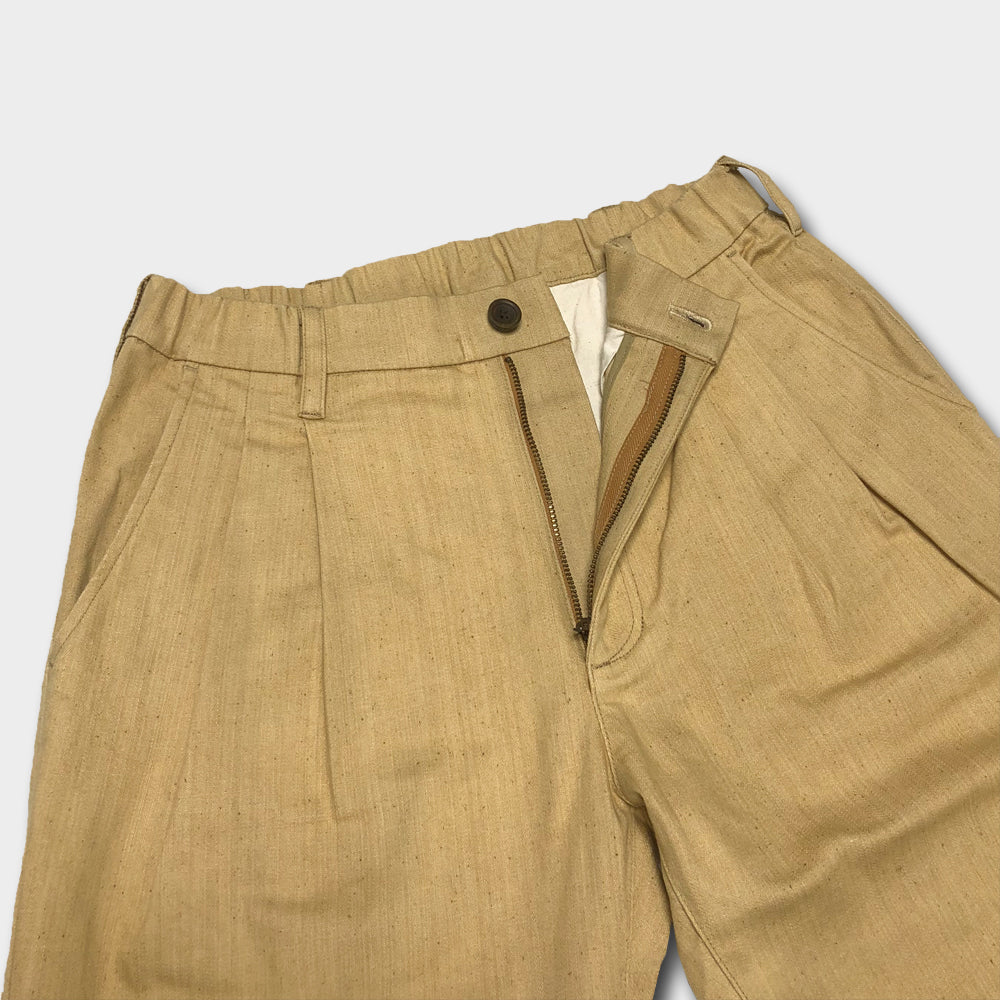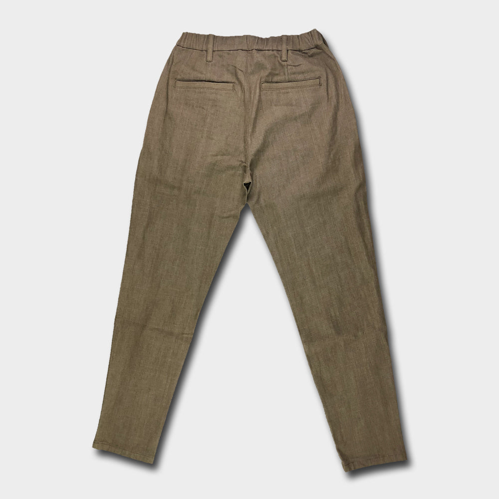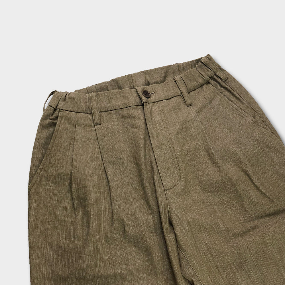 ウエストにタックを取り、腰回りにゆとりを持たせ、ストレッチ素材を使う事で、はき心地はとてもリラックスできるパンツ。