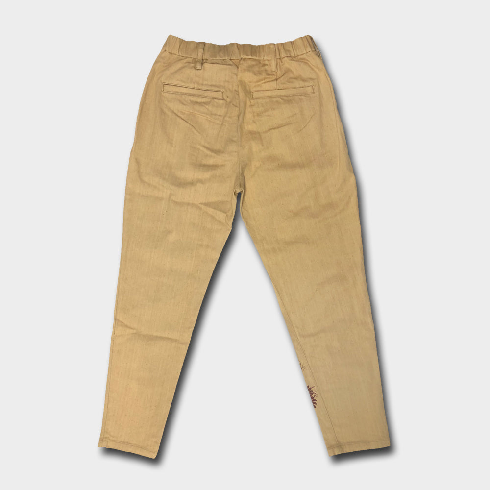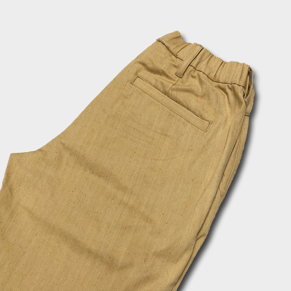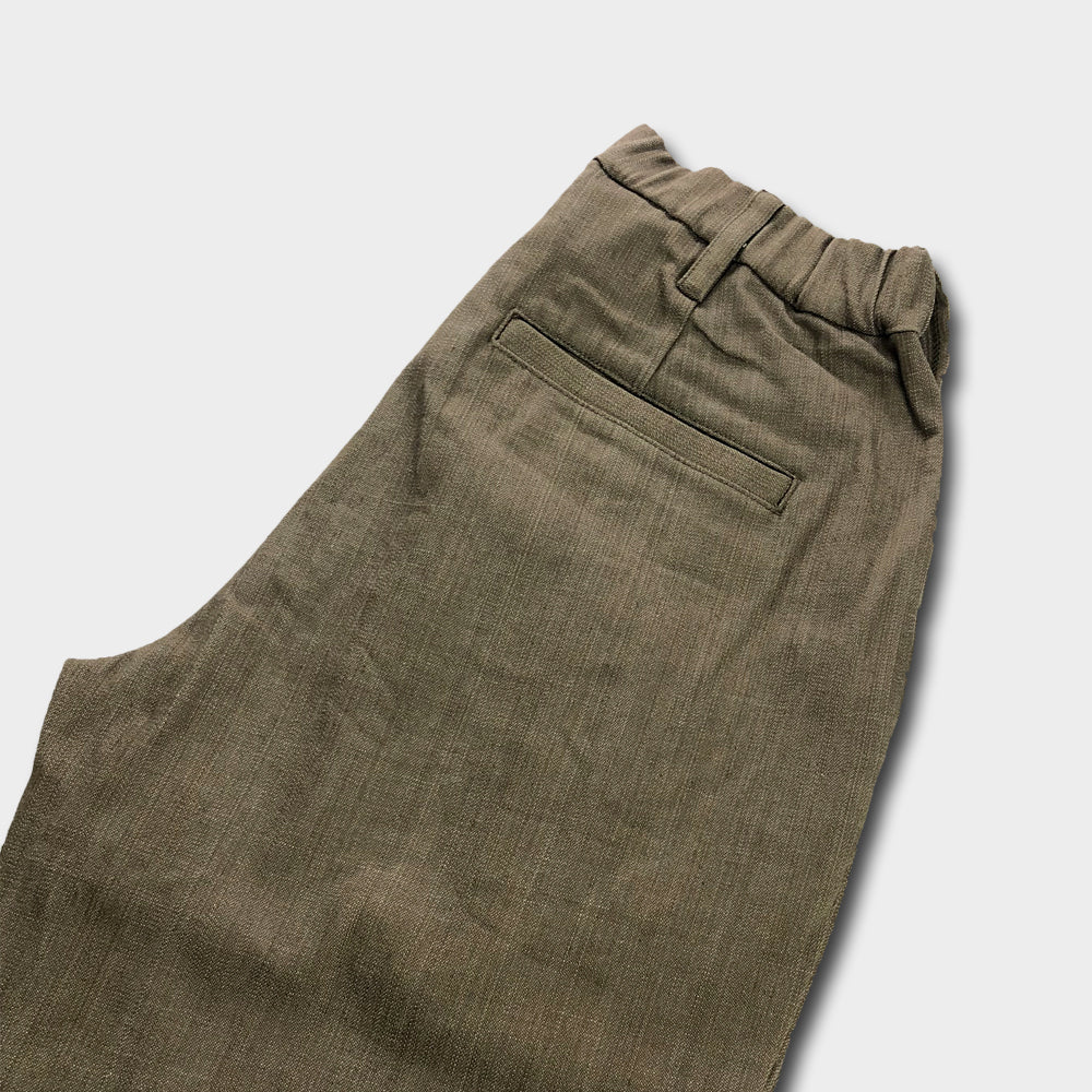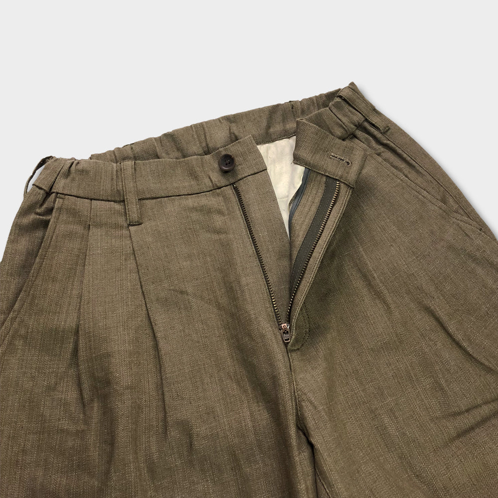 ウエストにタックを取り、腰回りにゆとりを持たせ、ストレッチ素材を使う事で、はき心地はとてもリラックスできるパンツ。