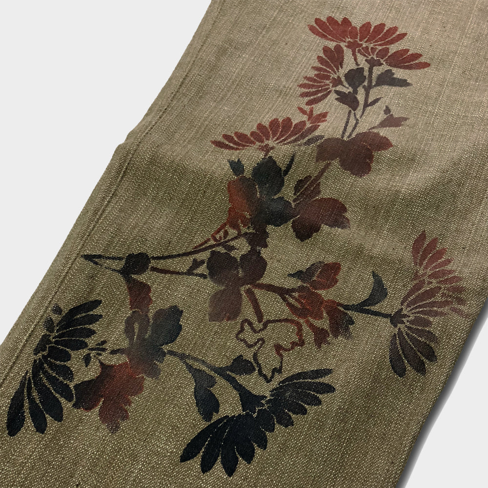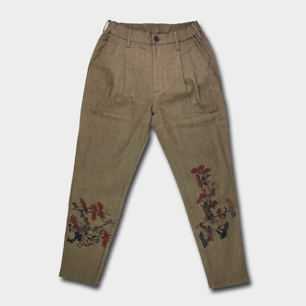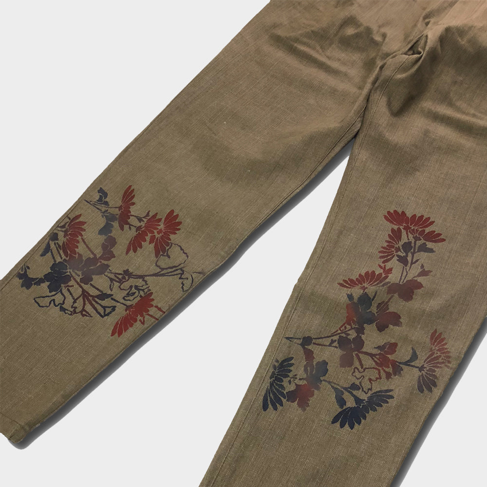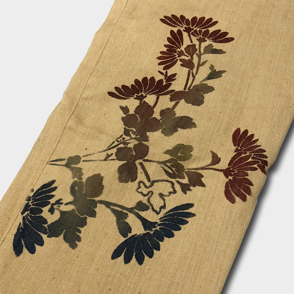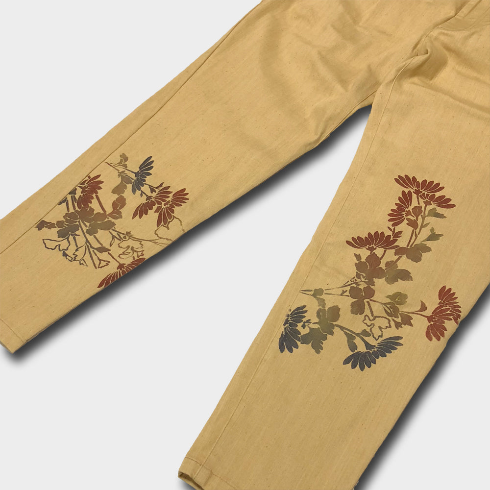 主衣のコーディネートに一役買ってくれるデザインパンツは、刷毛を使い色を刷り込む技法で「菊」を表現してあり、コーディネートにもさりげない存在感が使いやすい作品です。