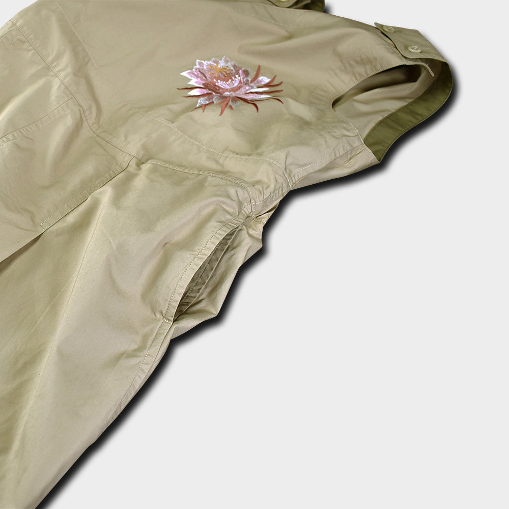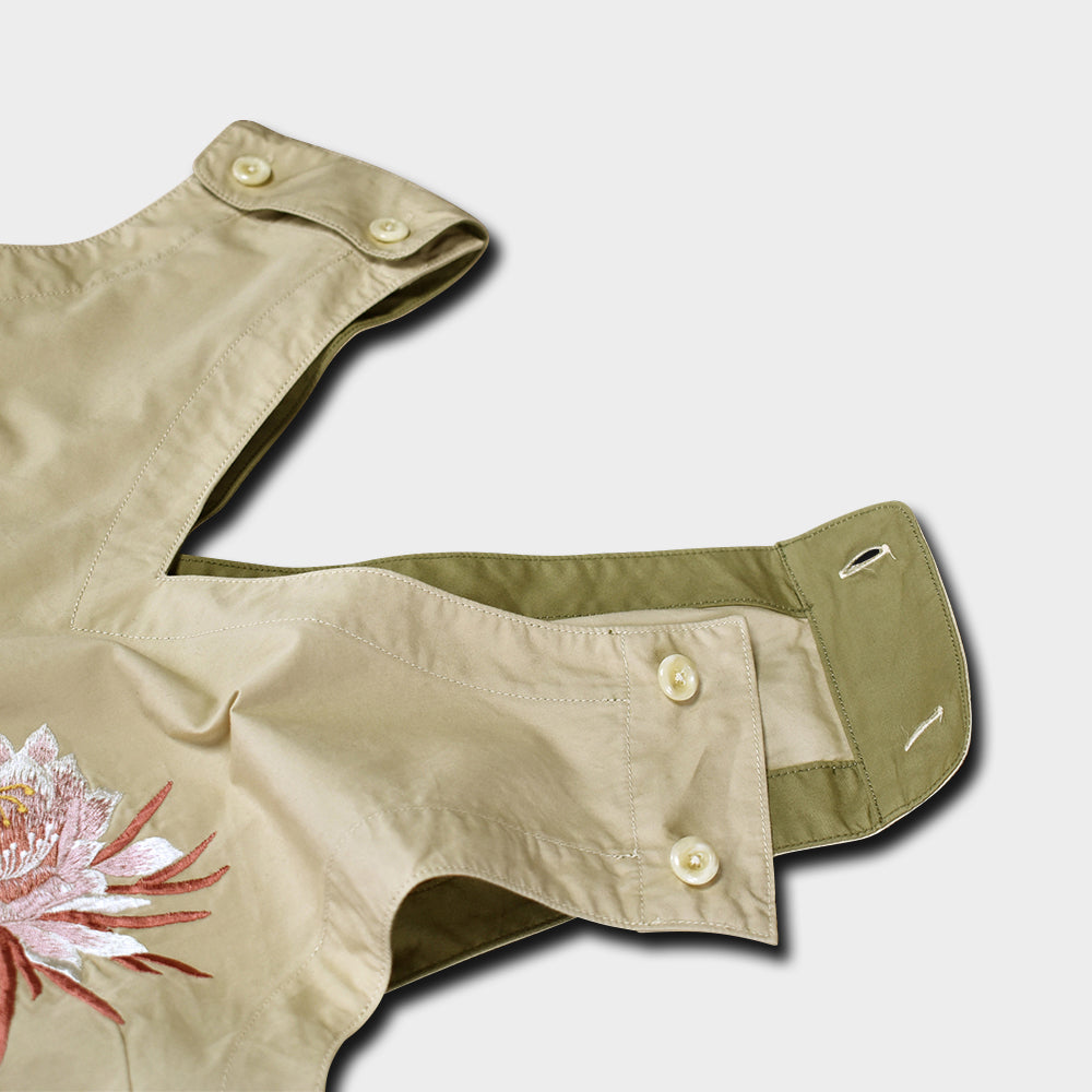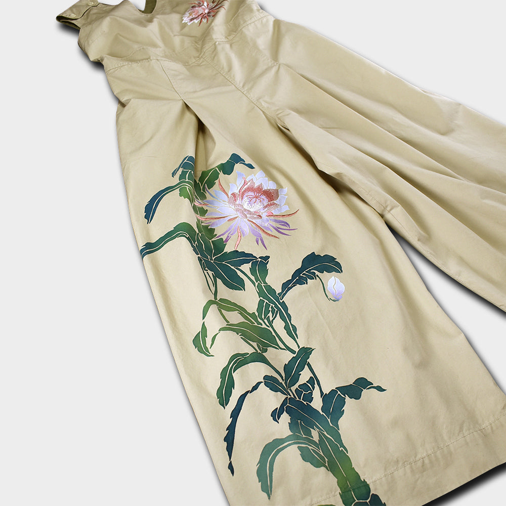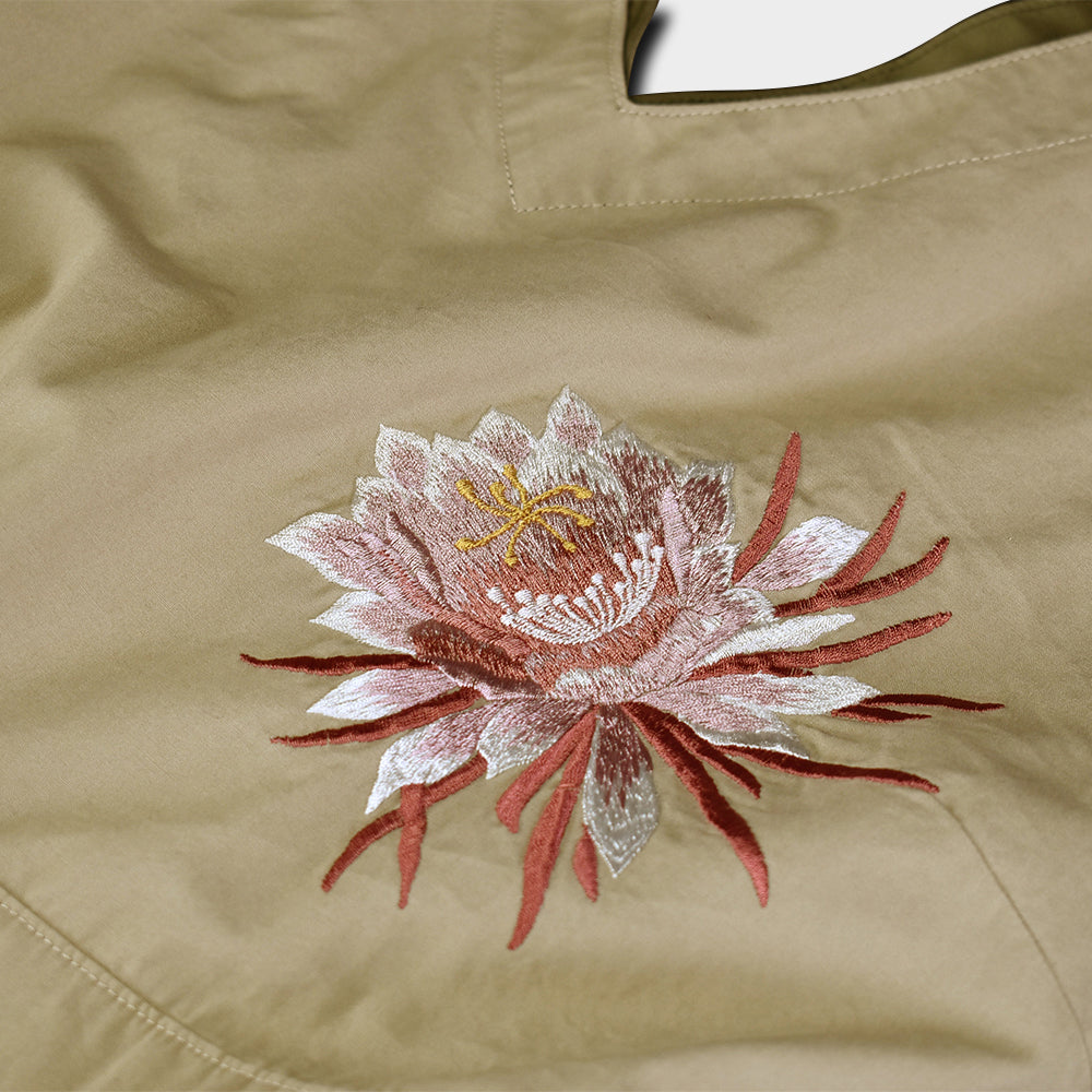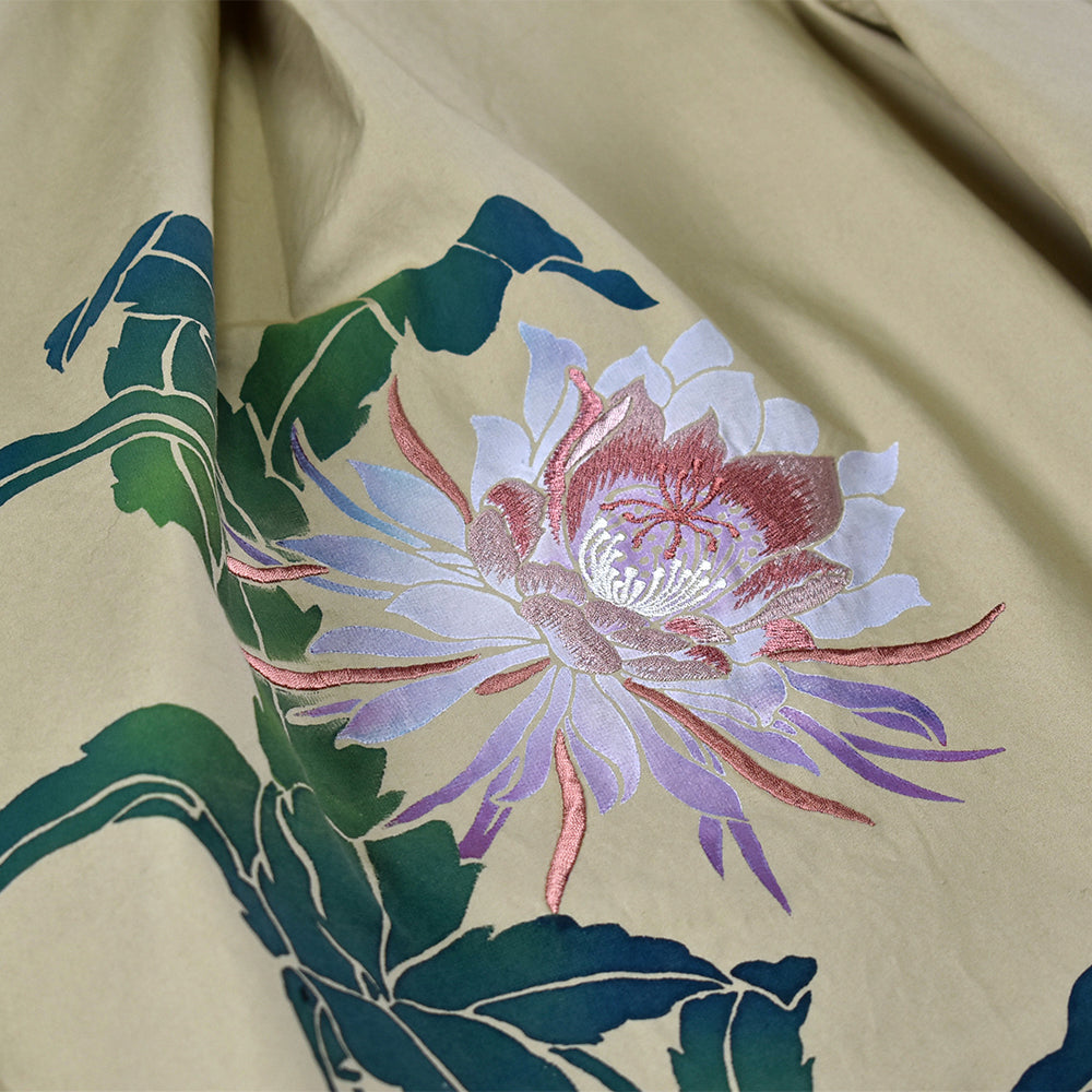 手仕事で刷り込まれた彩色の月下美人に、手振り刺繍でさらに優雅さをプラス。背筋を伸ばして歩く姿が凛々しくみえるというものです。