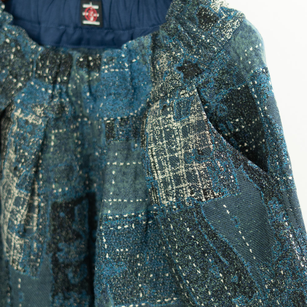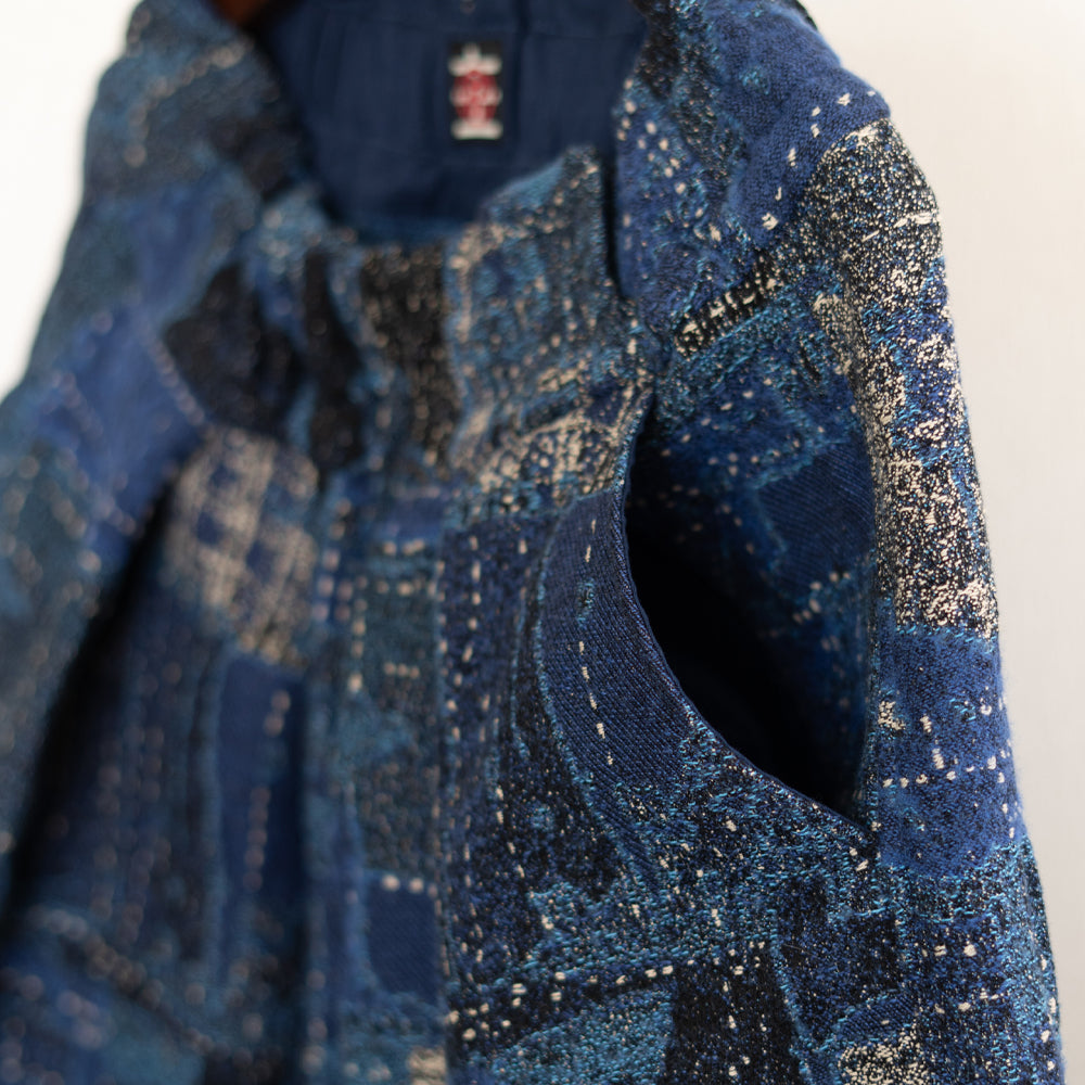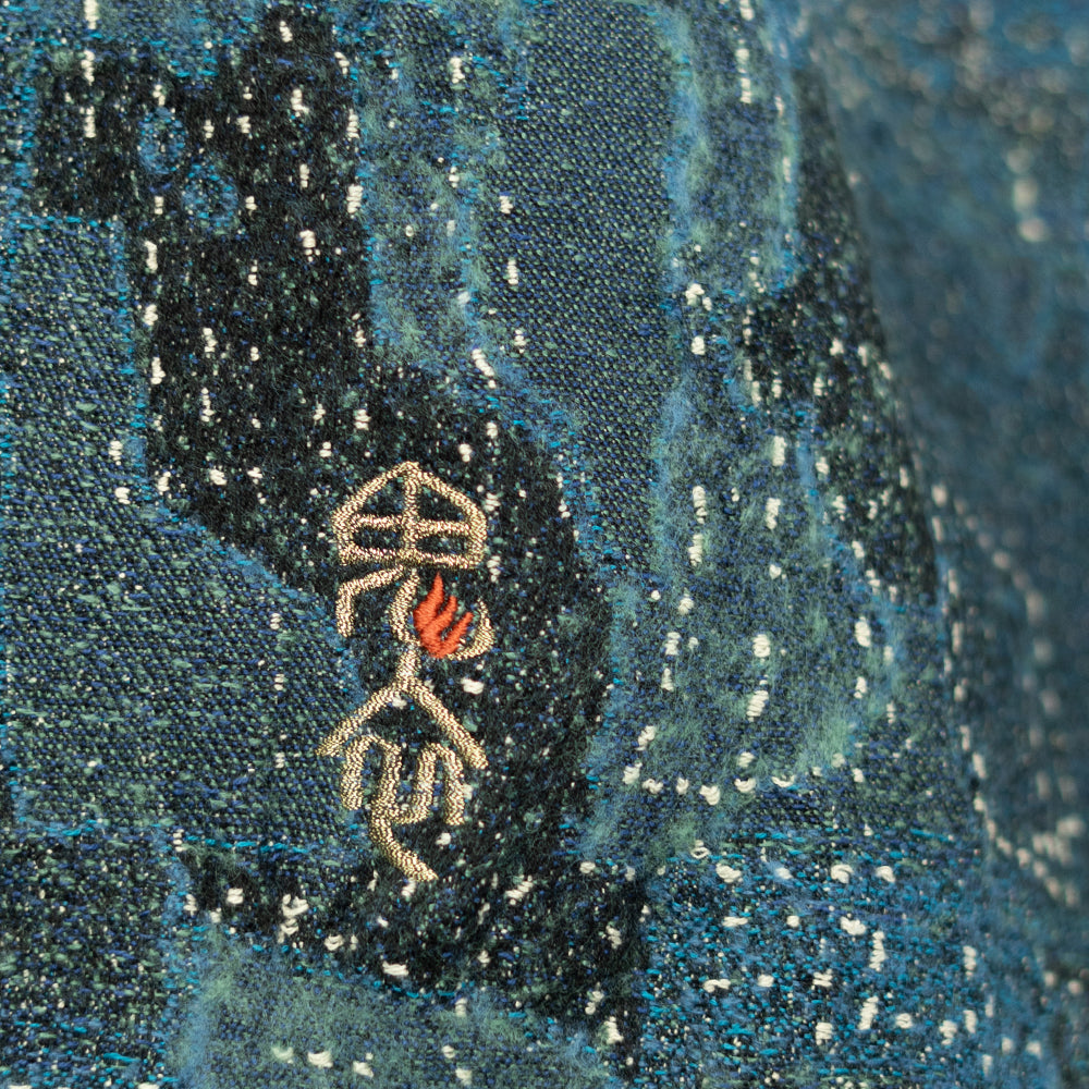 劣化した部分の表現はウールの糸を引っ搔いて作り、幾つかの蓄積された手仕事の部分は、考えられるだけの糸と織りを駆使して作り上げられただけに、圧巻の威力を放っています。