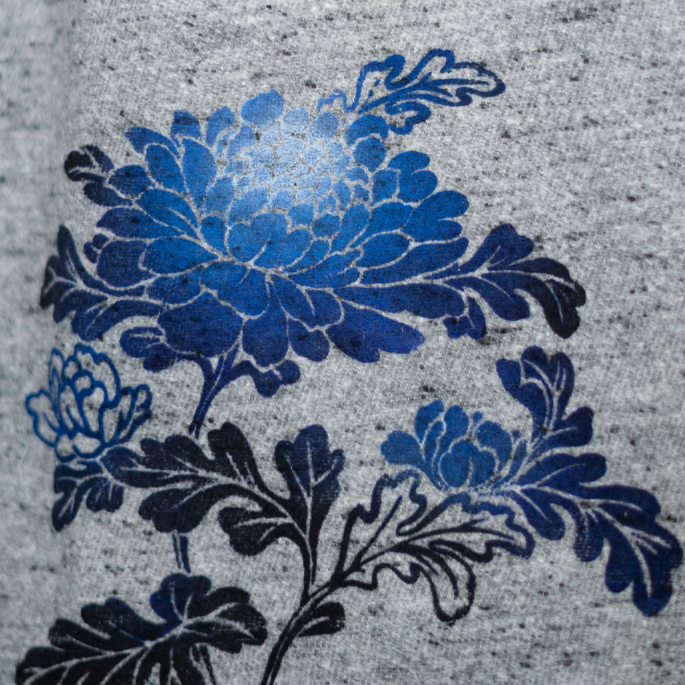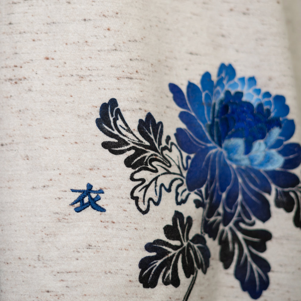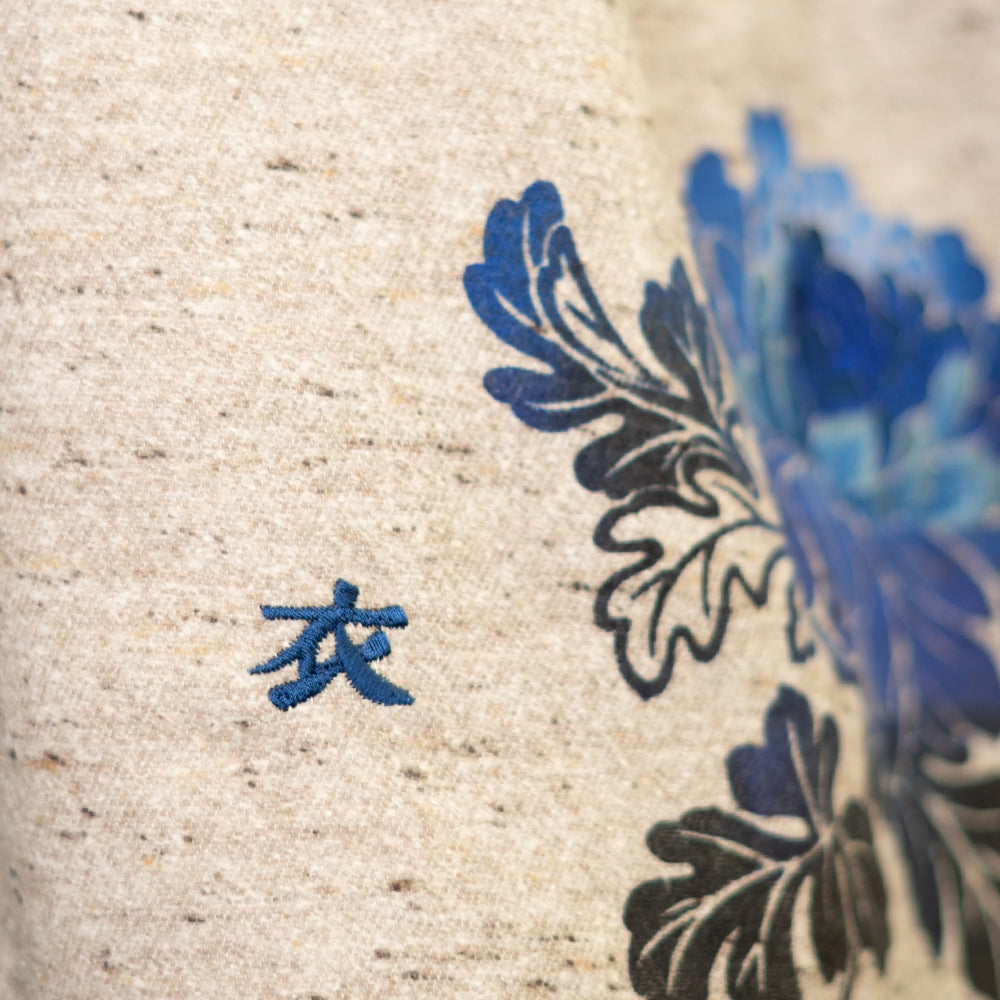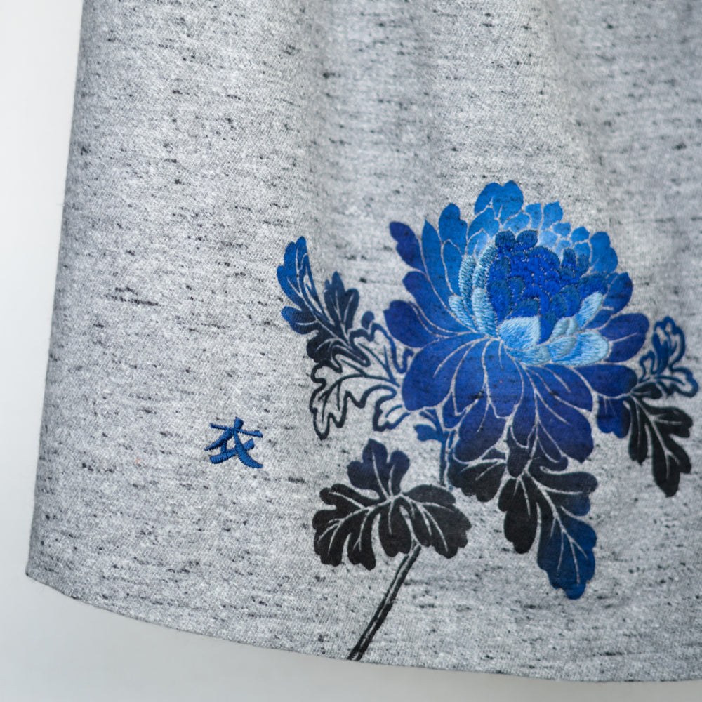 裾に大きく、プリントされているのは自然界には存在しない青い菊です。