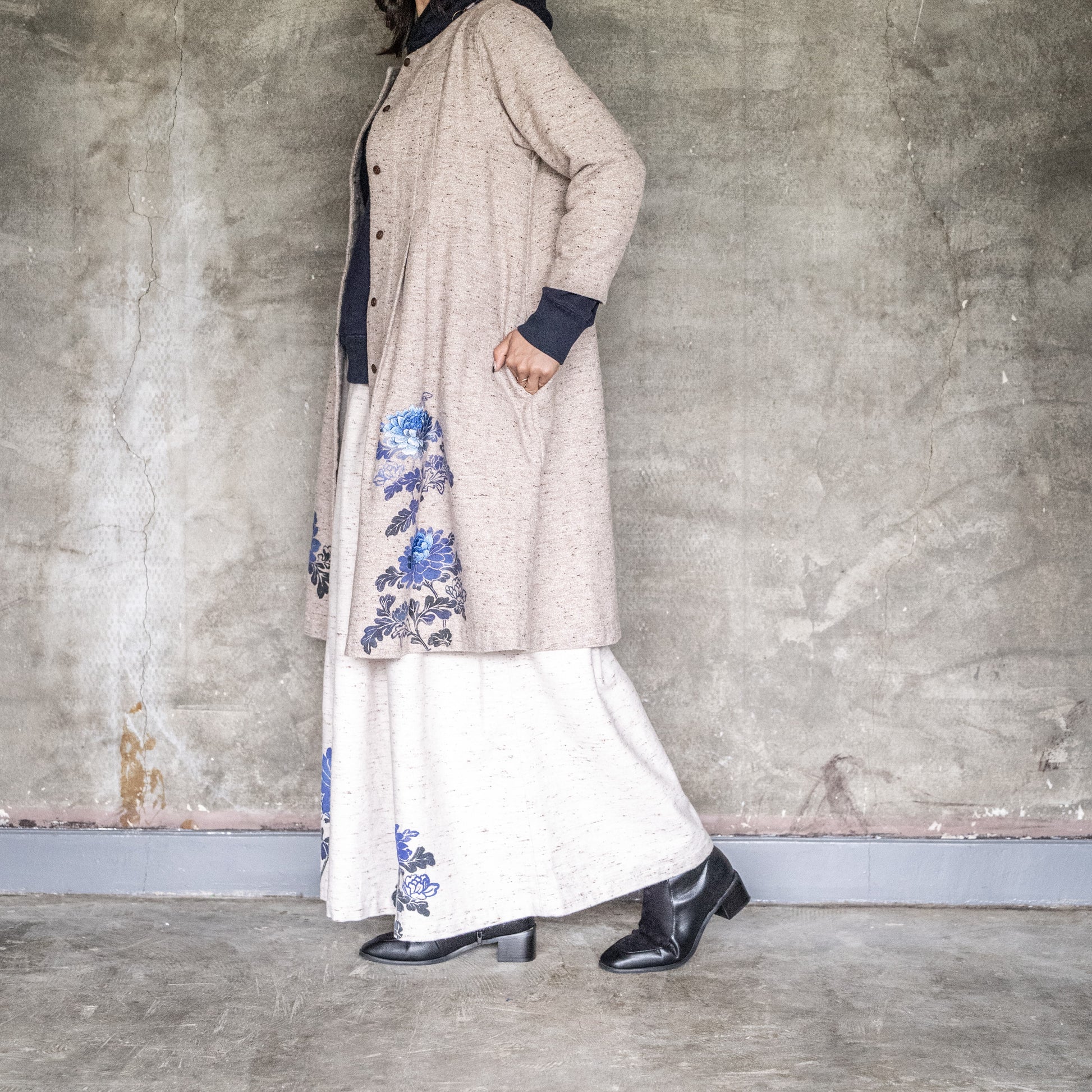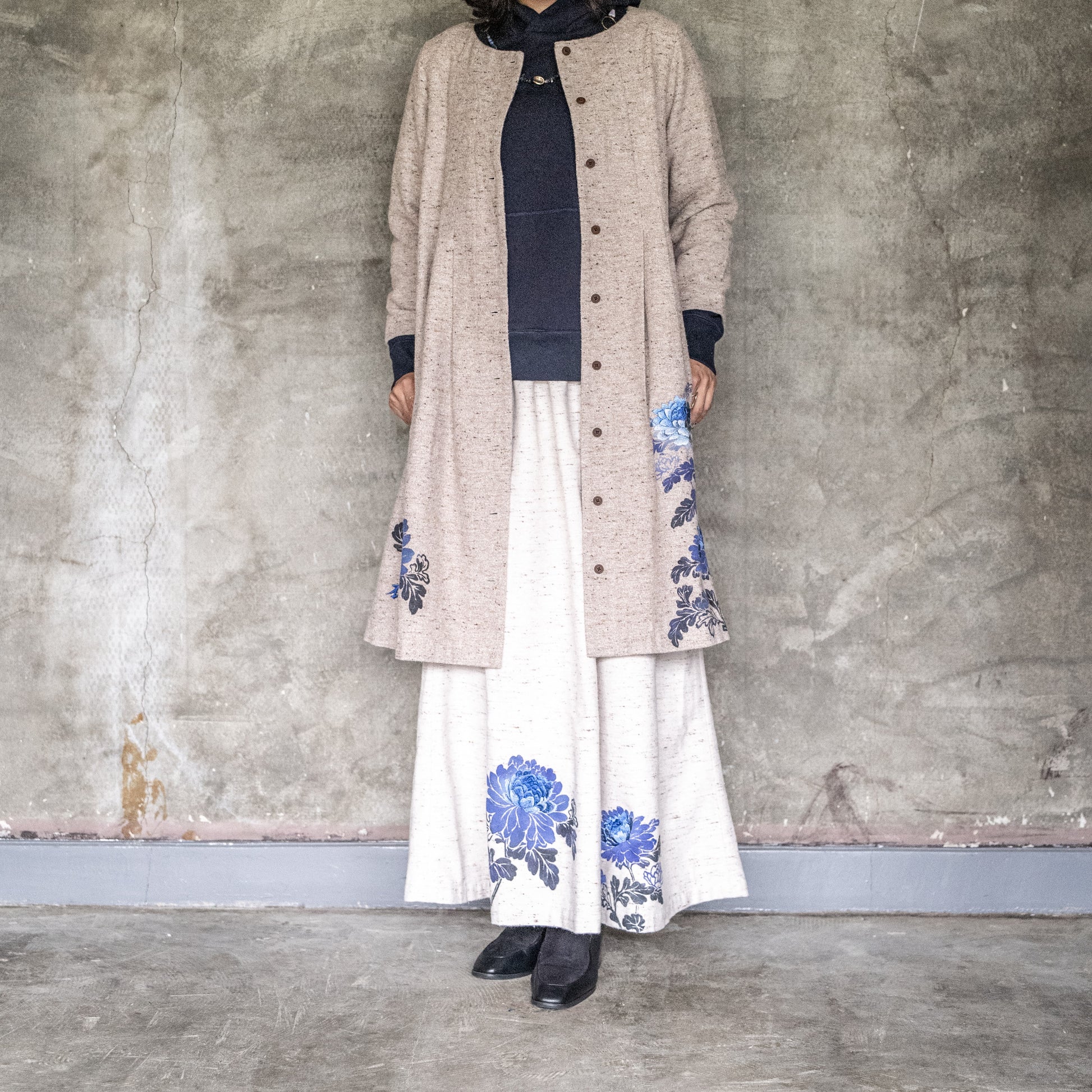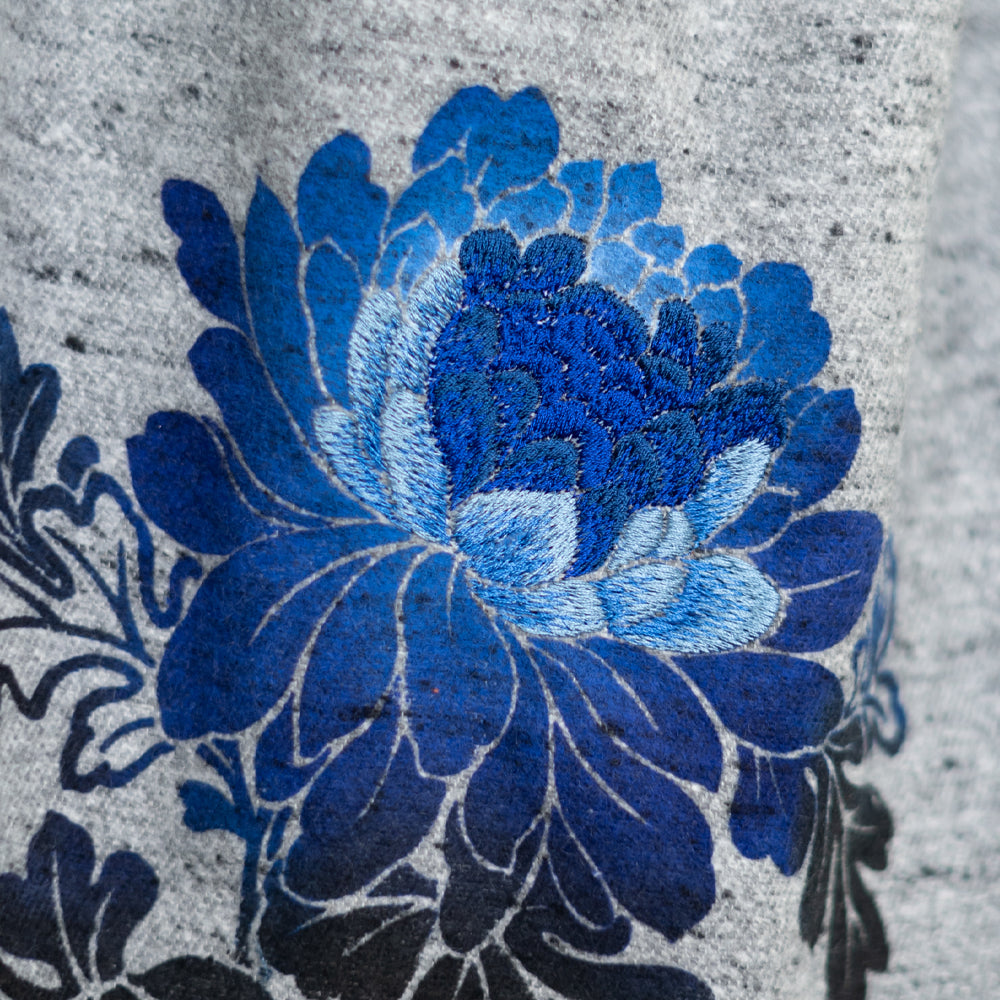 裾に大きく、プリントされているのは自然界には存在しない青い菊です。