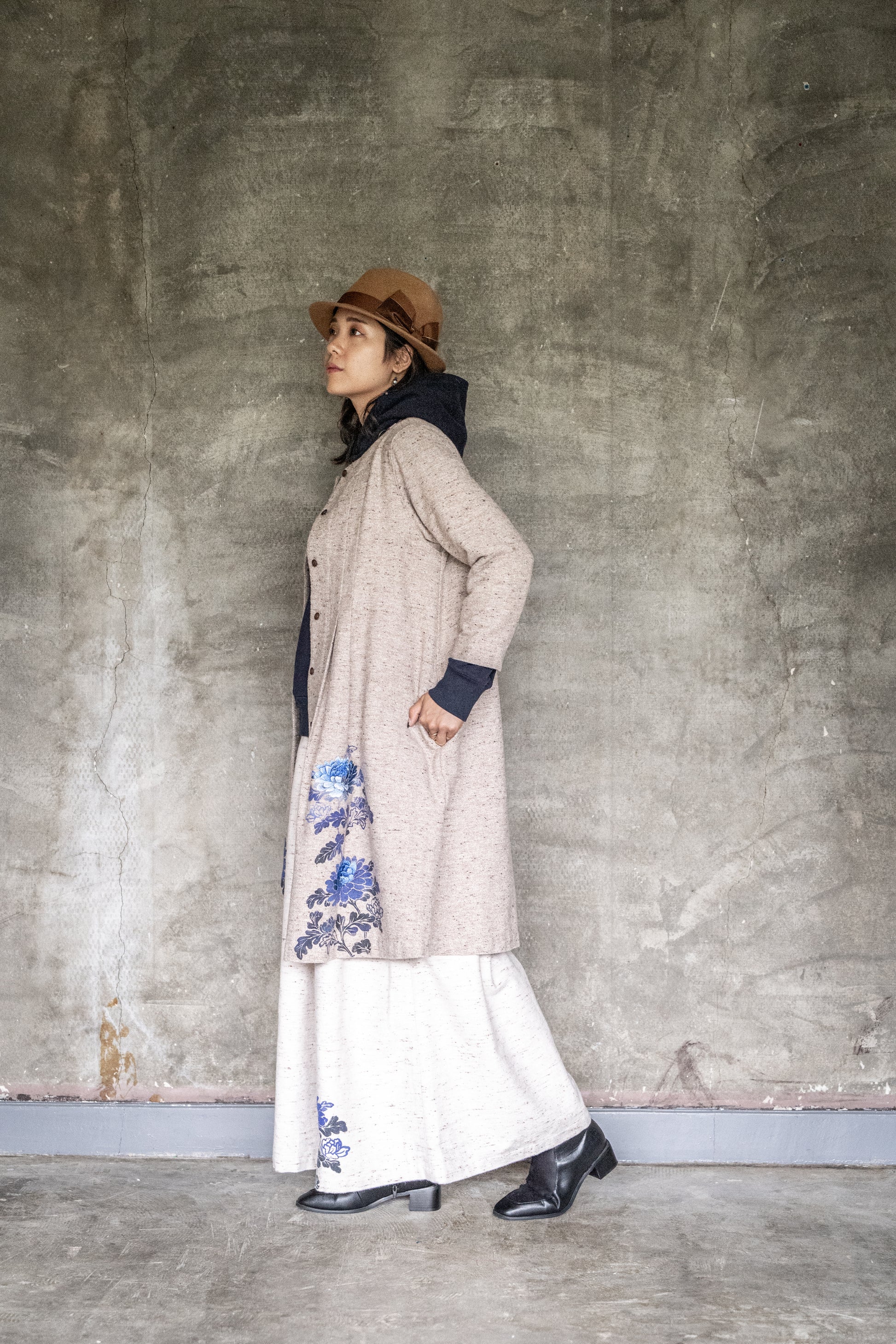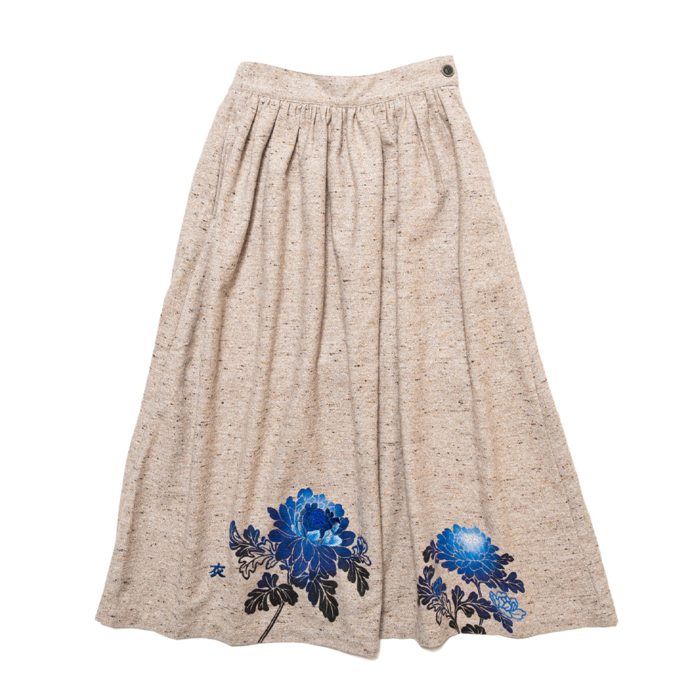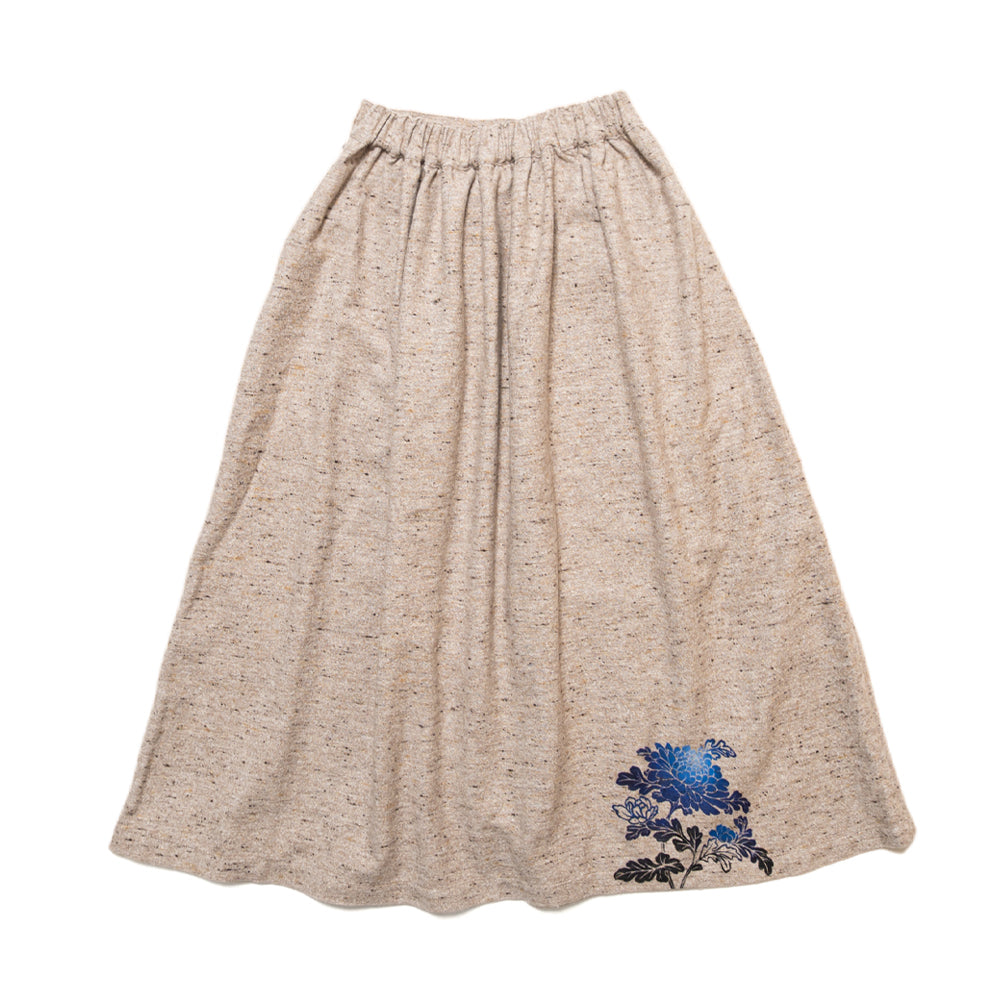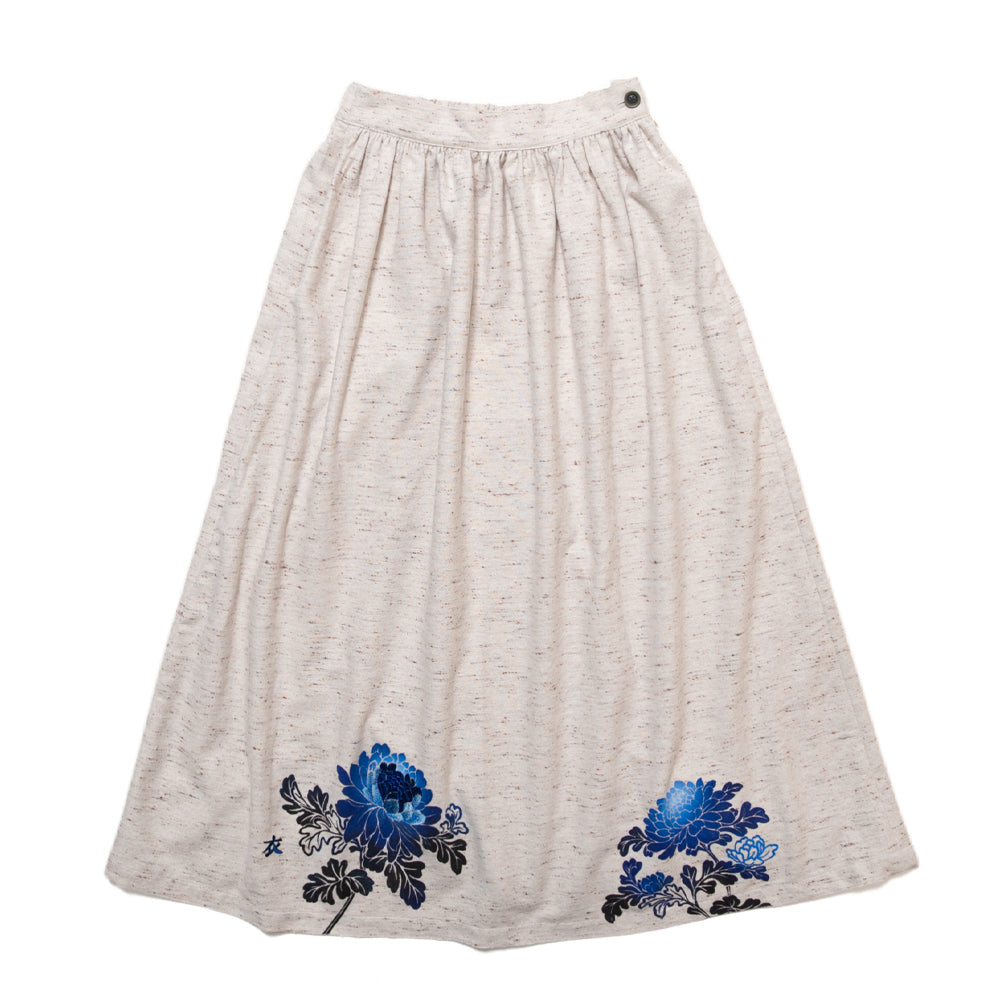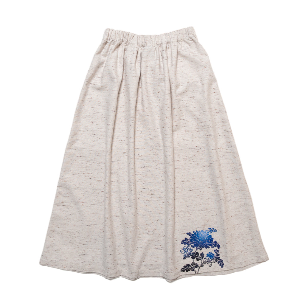 シンプルなトップスと合わせるだけで素材と菊の魅力が引き立ち、さまざまなコーディネートが楽しめます。
