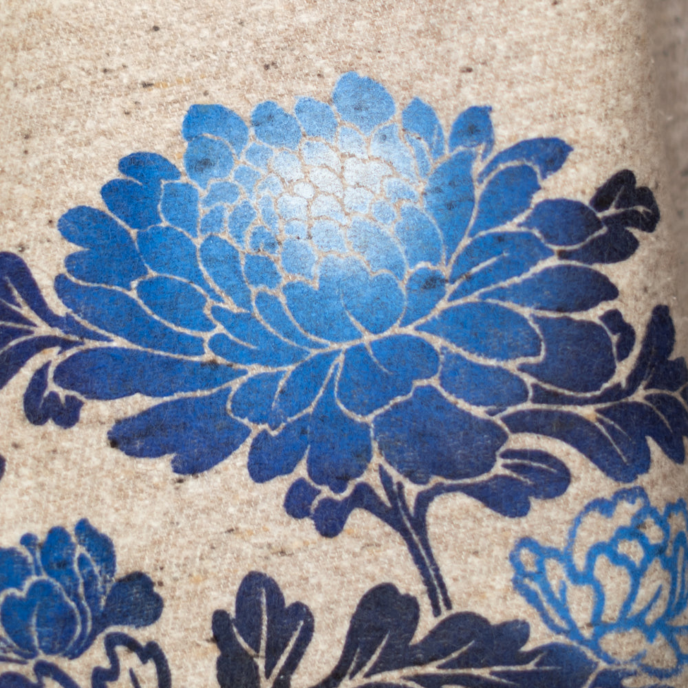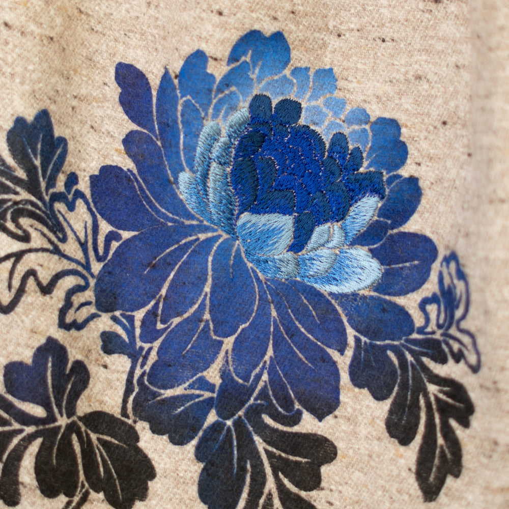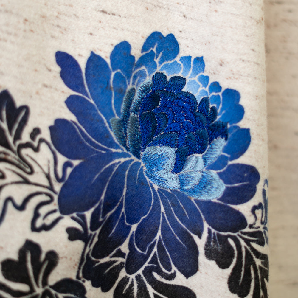 職人の手で、青いグラデーションが見事に描かれた上に、手振り刺繍の糸のグラデーションが、重なる青い菊をご覧ください。