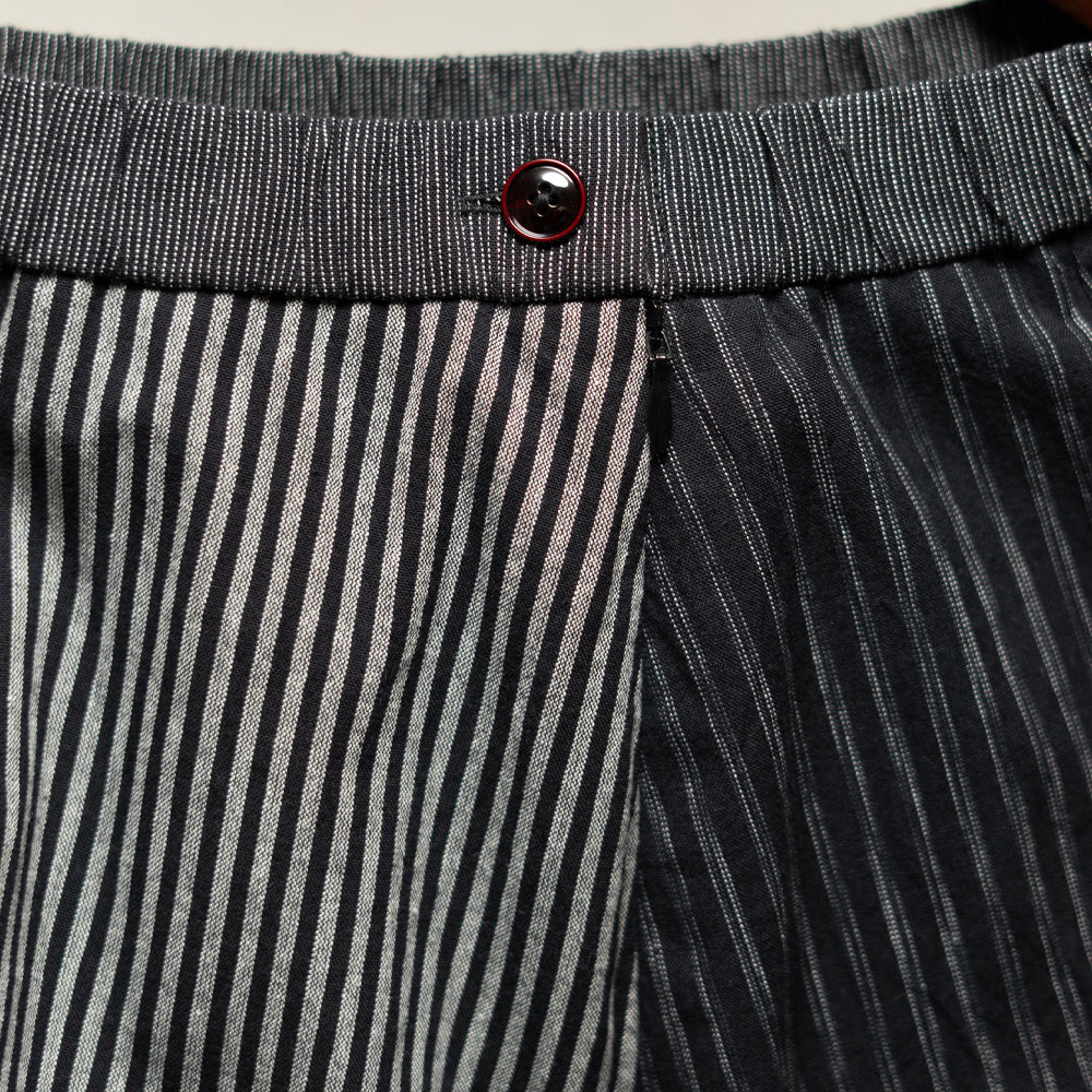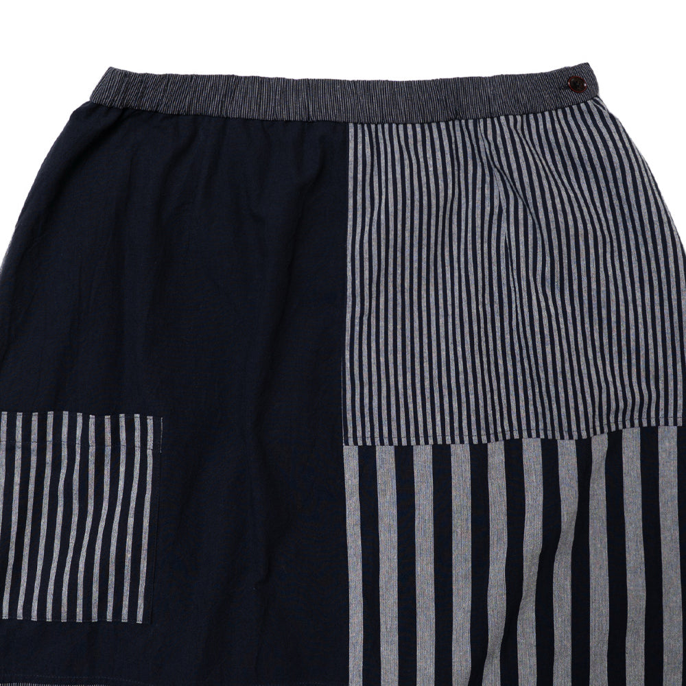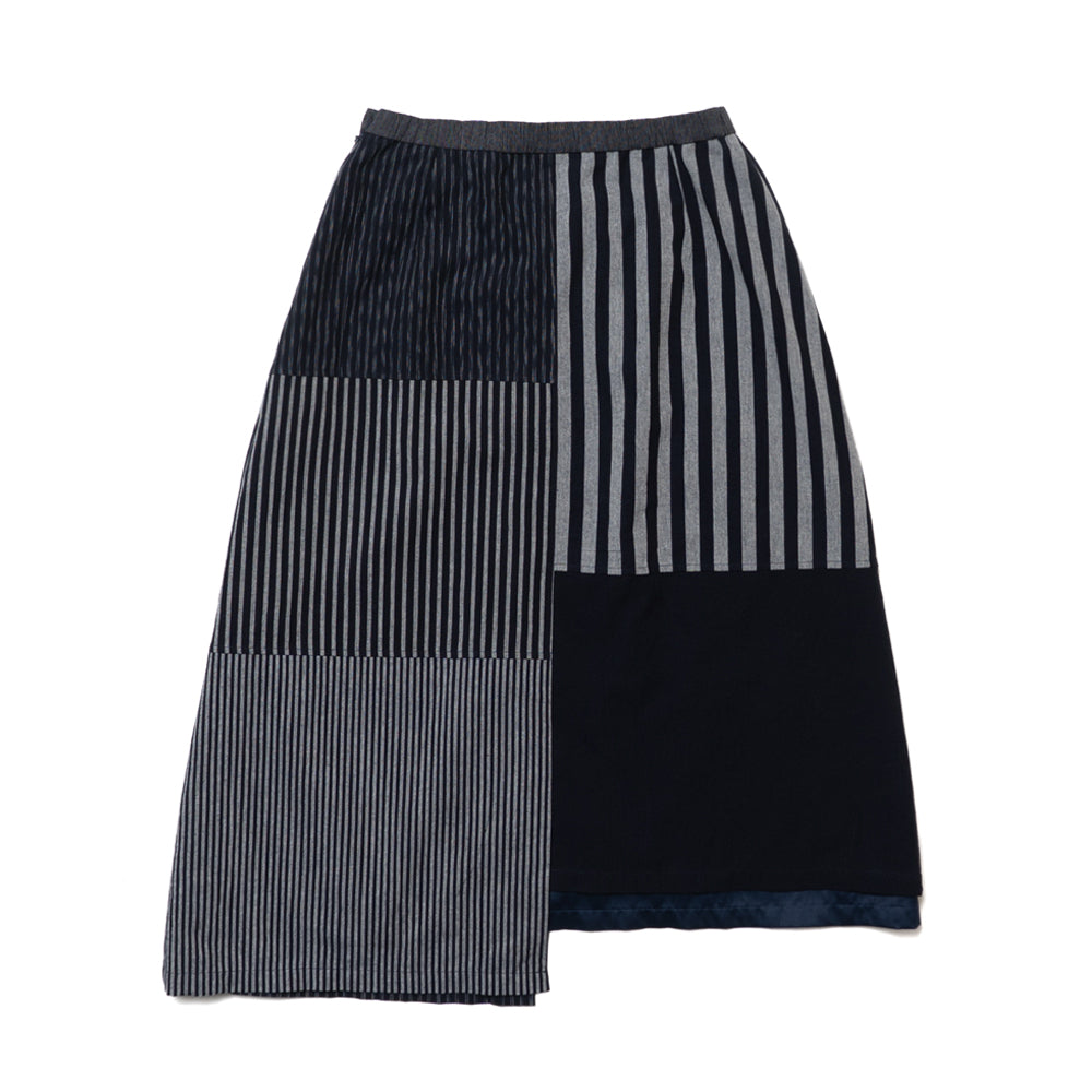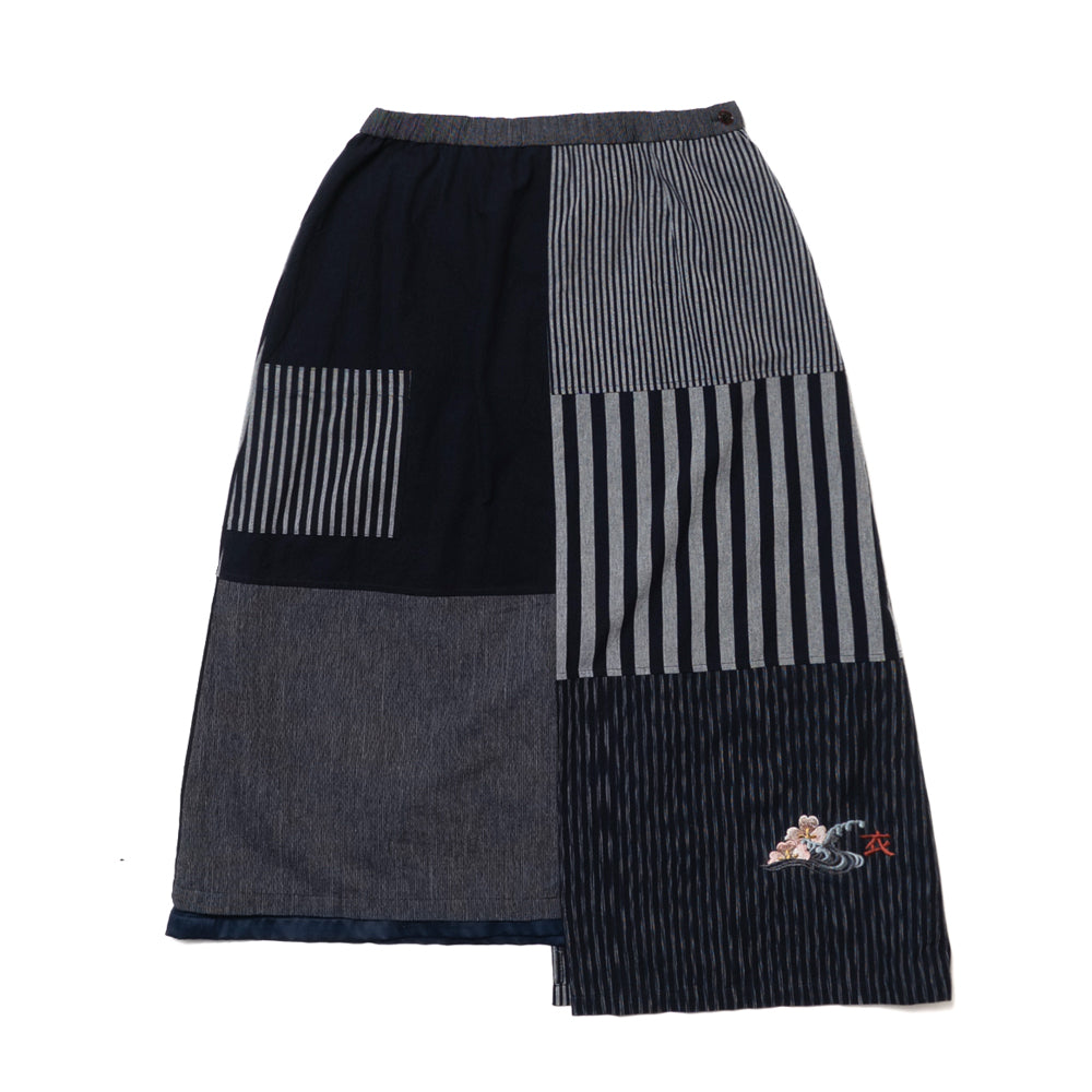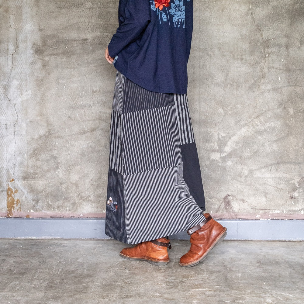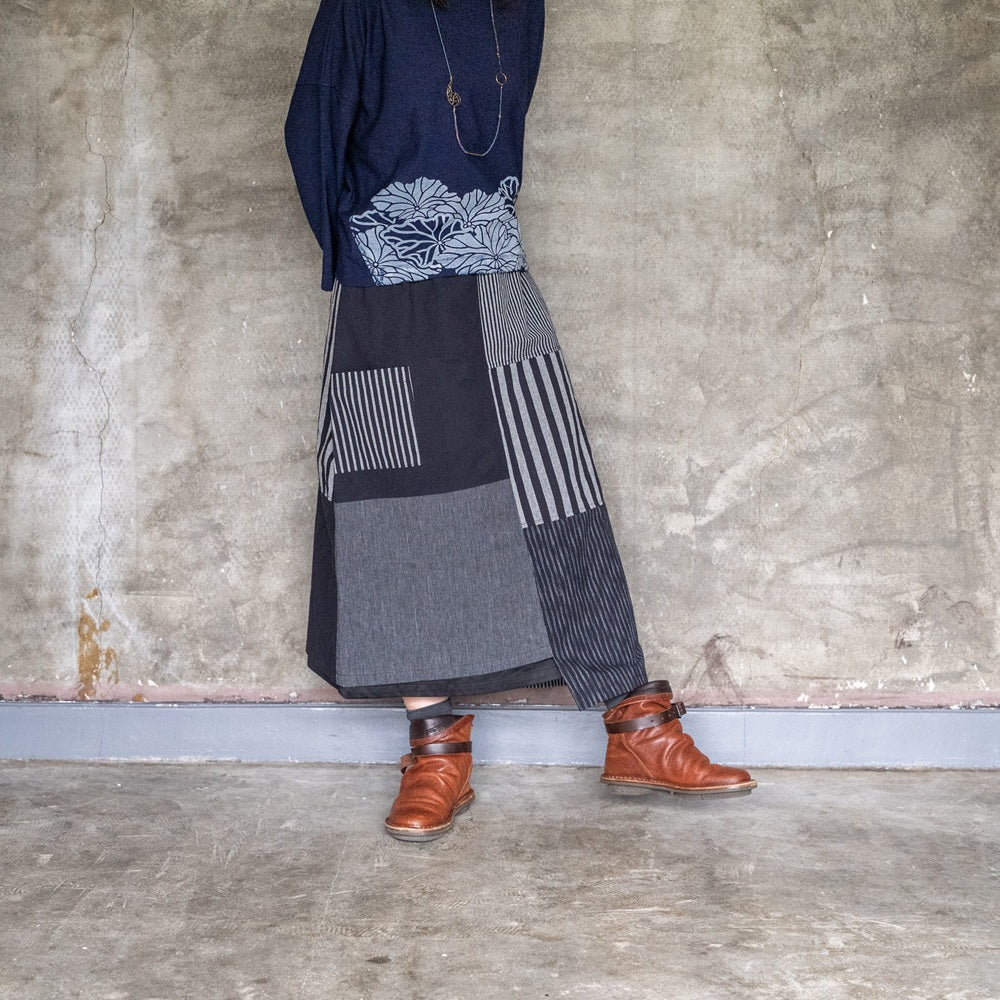 スピードが勝負の現代の織機に逆らうように 古い織り機で大きな音をたてて、ゆっくり進んでいく織物が亀田縞です。七種類の亀田縞の生地を、巧みに組み合わせて出来上がったスカートの裾には、日本海の波と、春を待つ桜の文様の手振り刺繍が入っています。