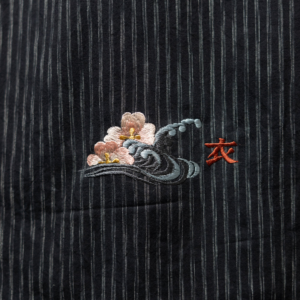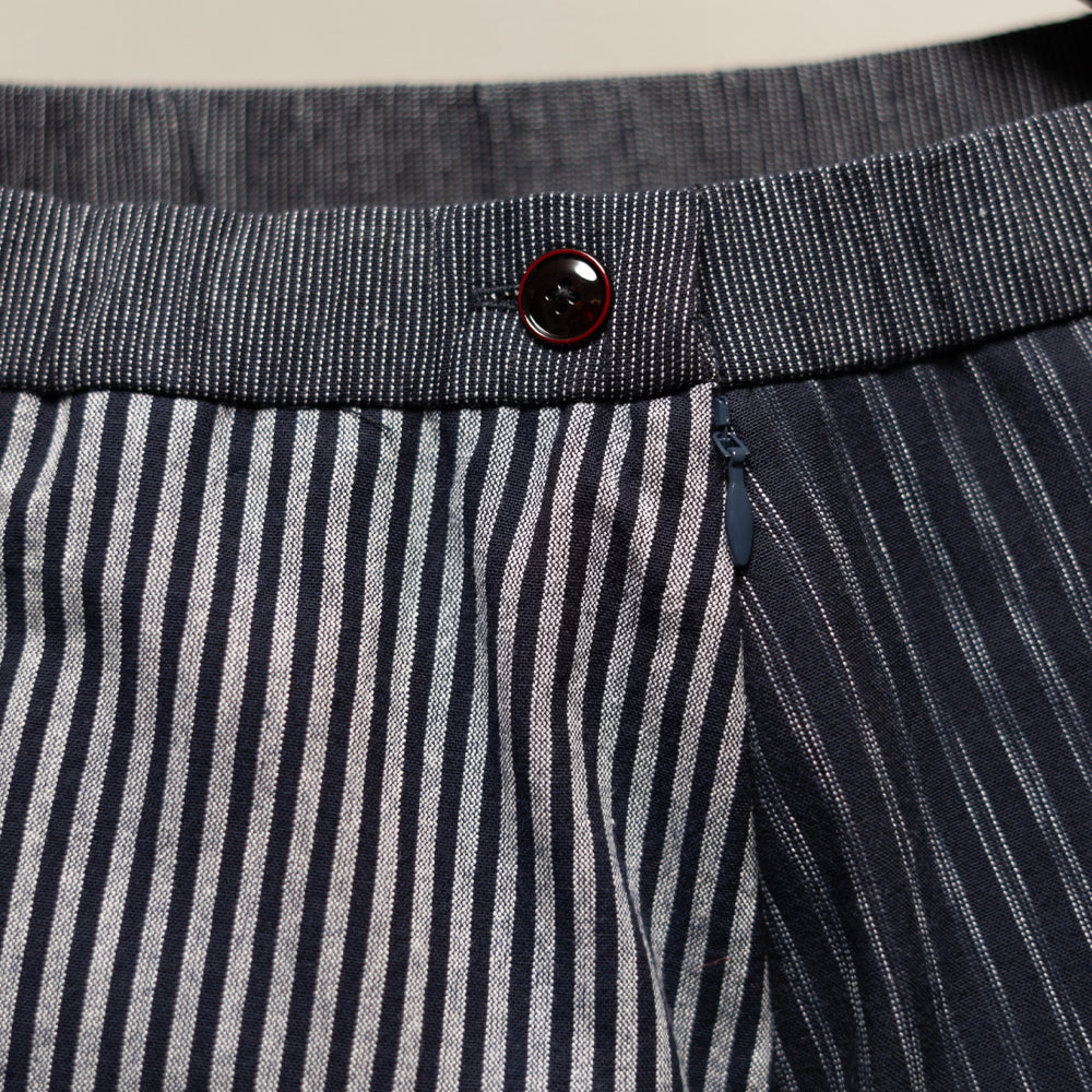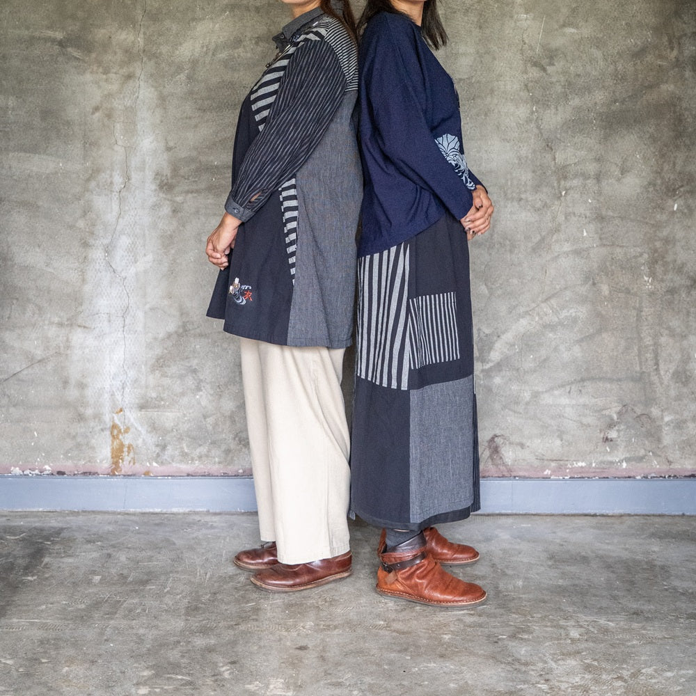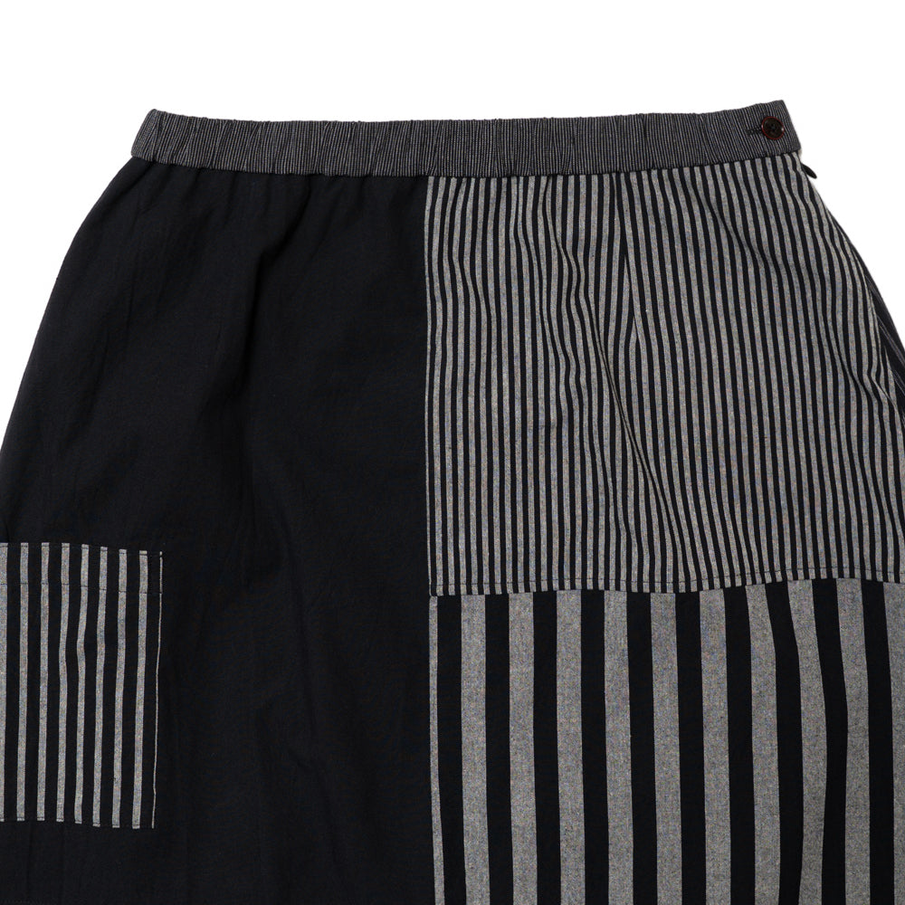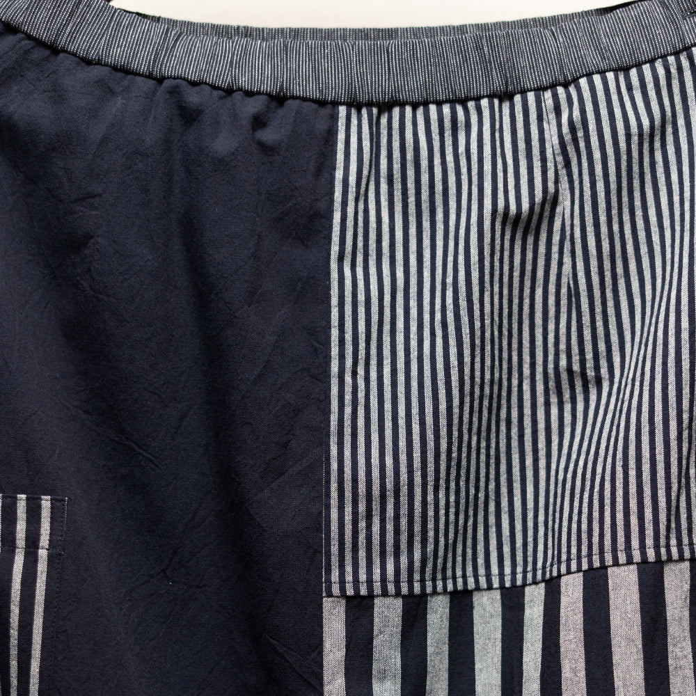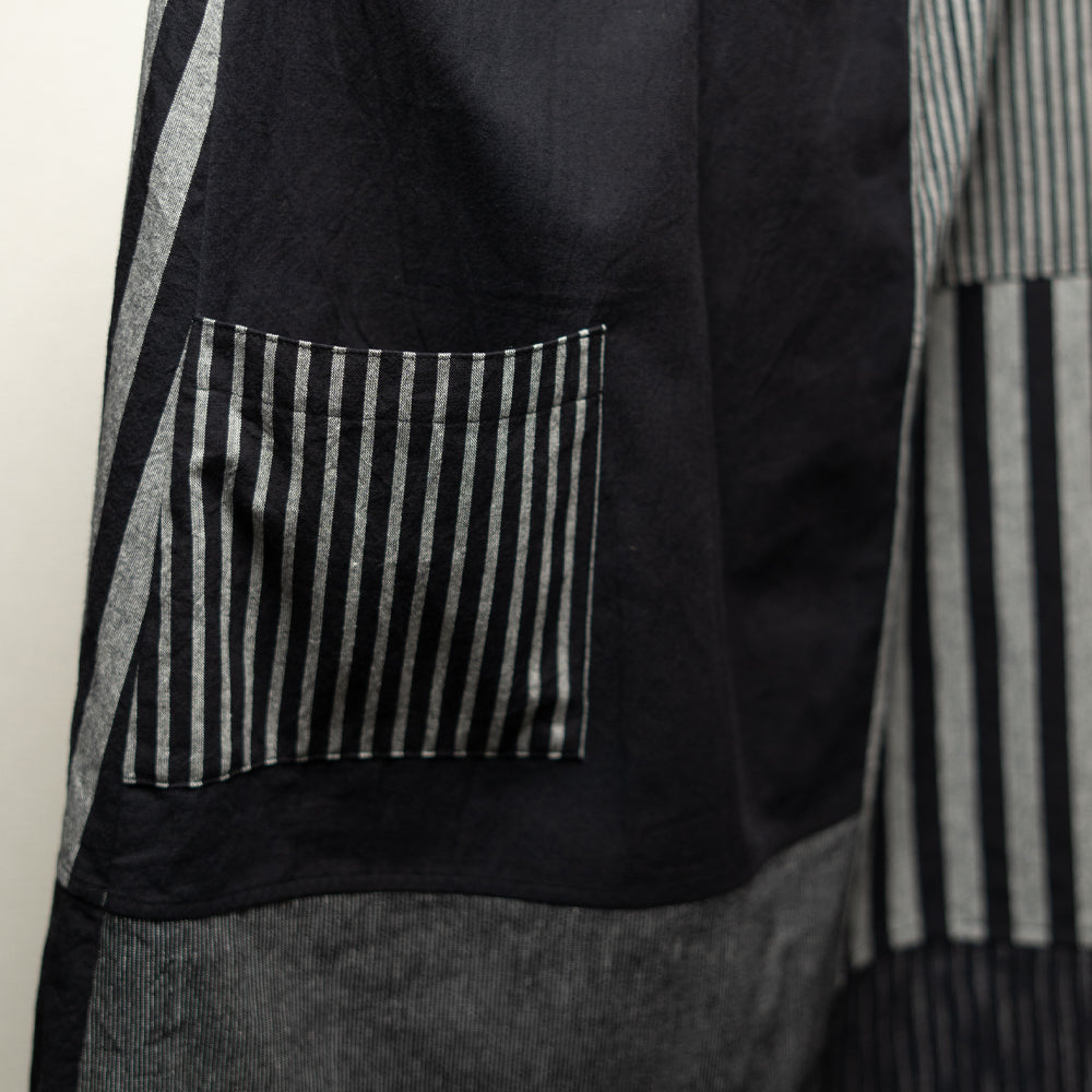 スピードが勝負の現代の織機に逆らうように 古い織り機で大きな音をたてて、ゆっくり進んでいく織物が亀田縞です。七種類の亀田縞の生地を、巧みに組み合わせて出来上がったスカートの裾には、日本海の波と、春を待つ桜の文様の手振り刺繍が入っています。