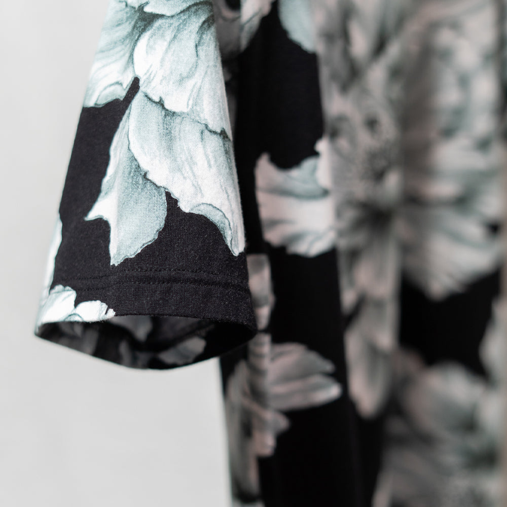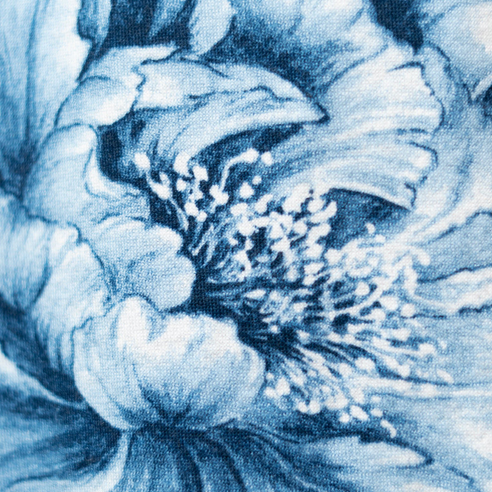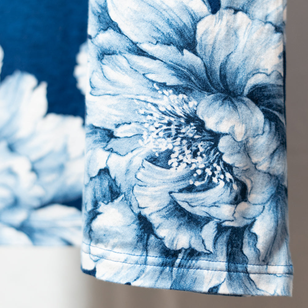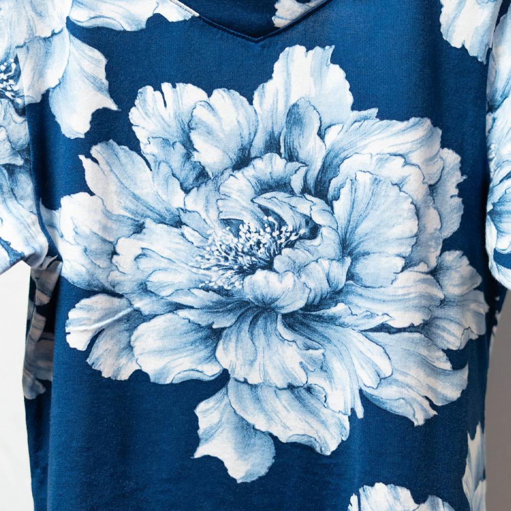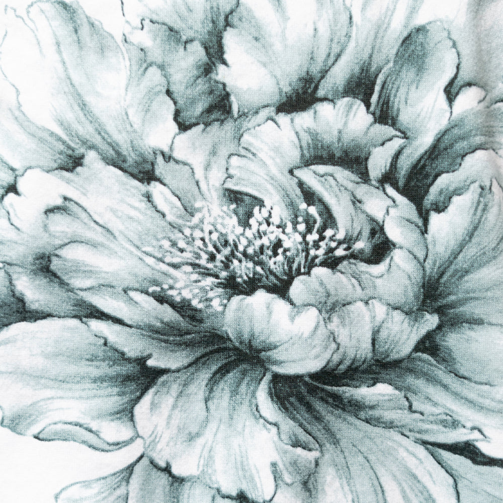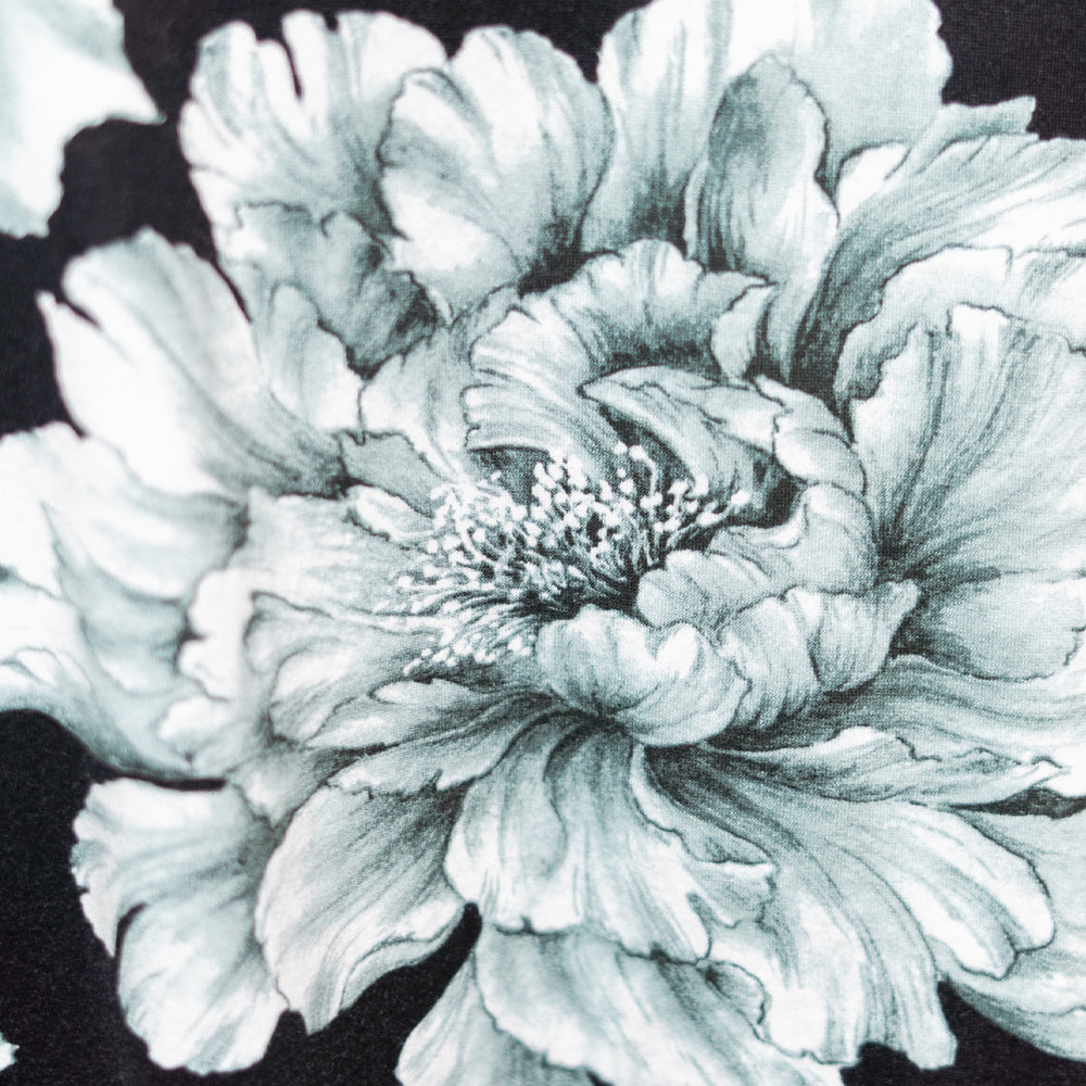 墨の濃淡やぼかしを巧みに使い分け、無駄をそぎ落として描かれた牡丹の花が、大胆に天竺の総柄になりました。