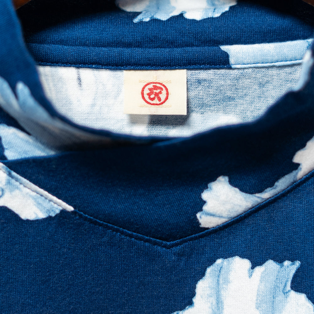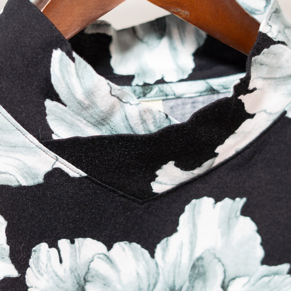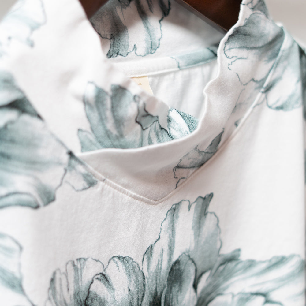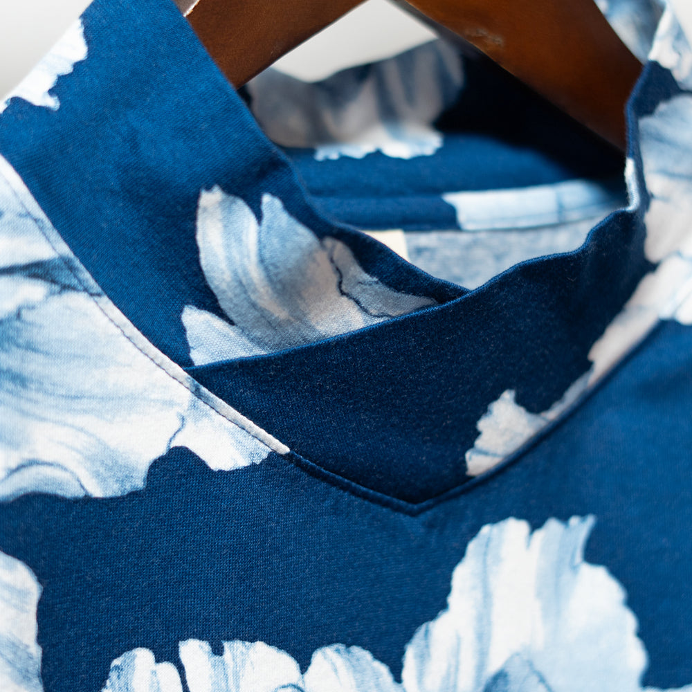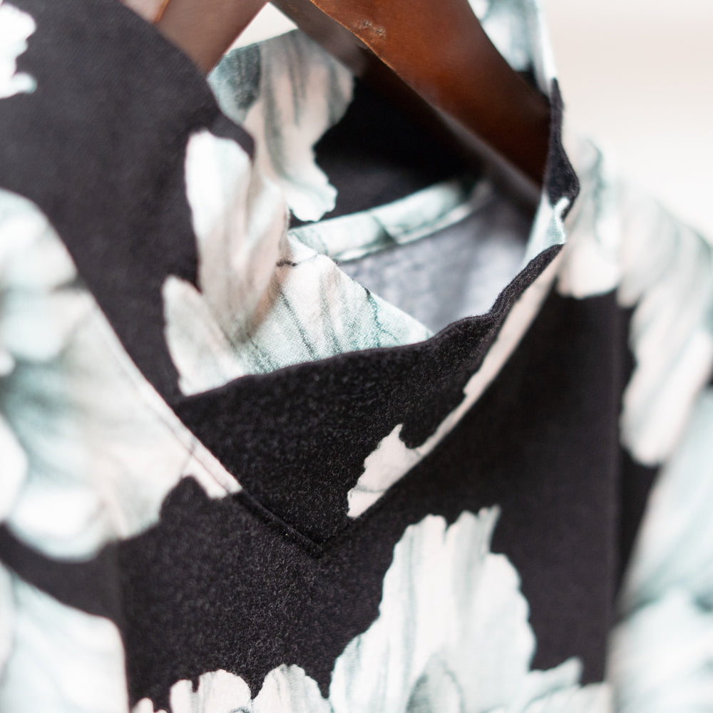 そんな総柄を、プチハイネックで首が見える部分を多くした上に、前部分に浅い衿合わせを作り着物衿を連想させています。