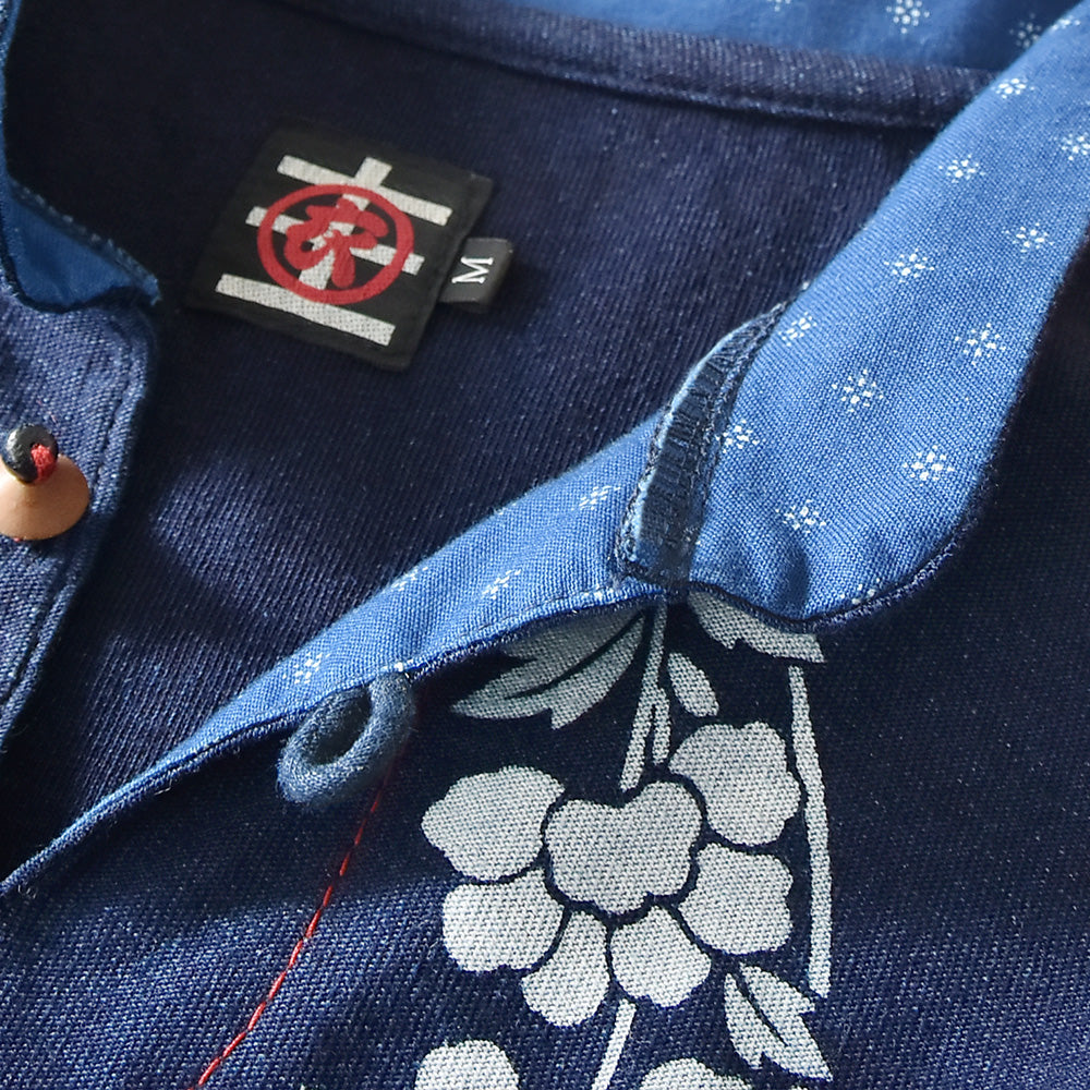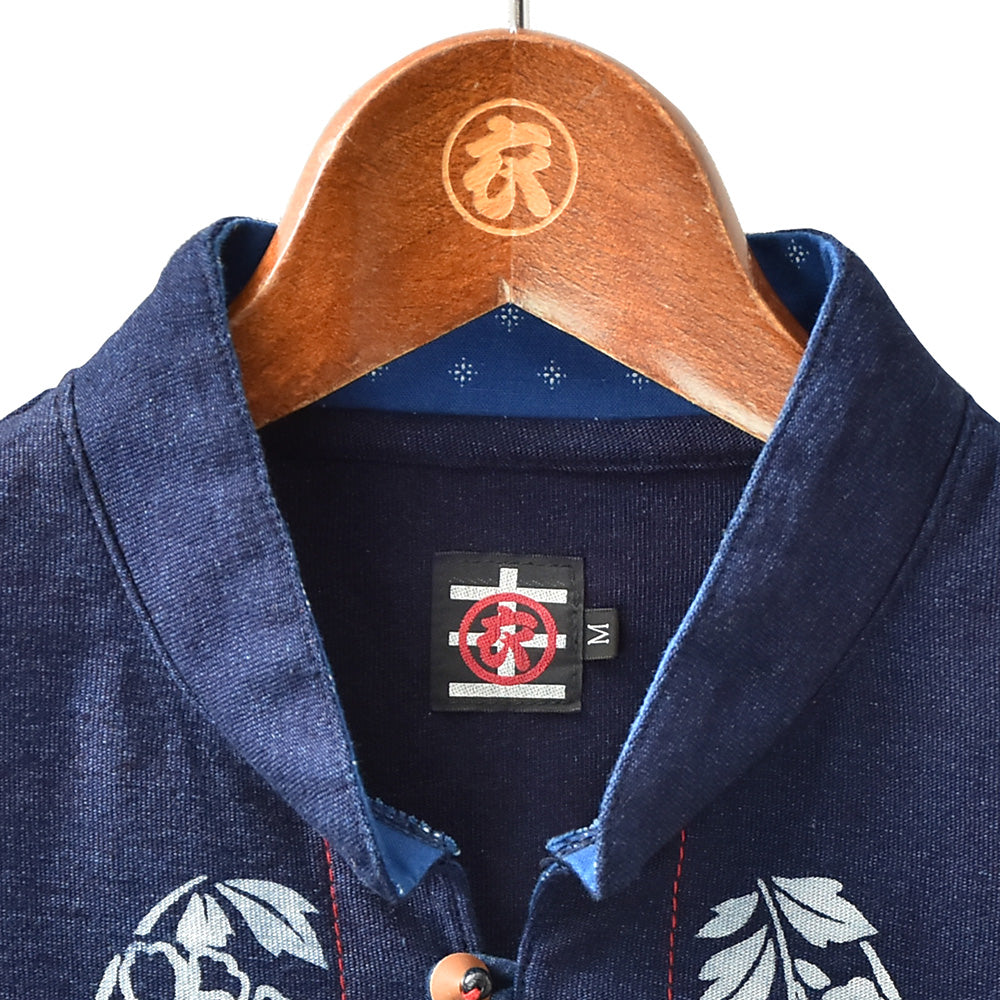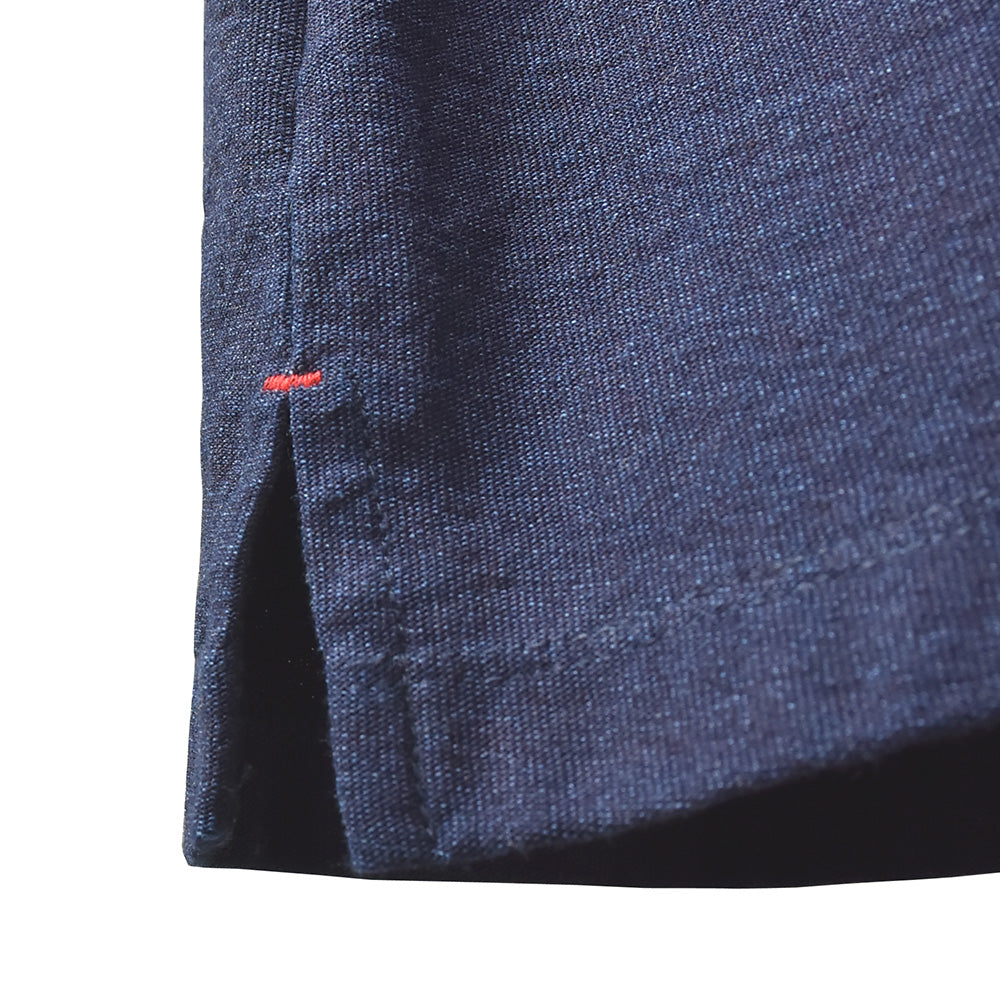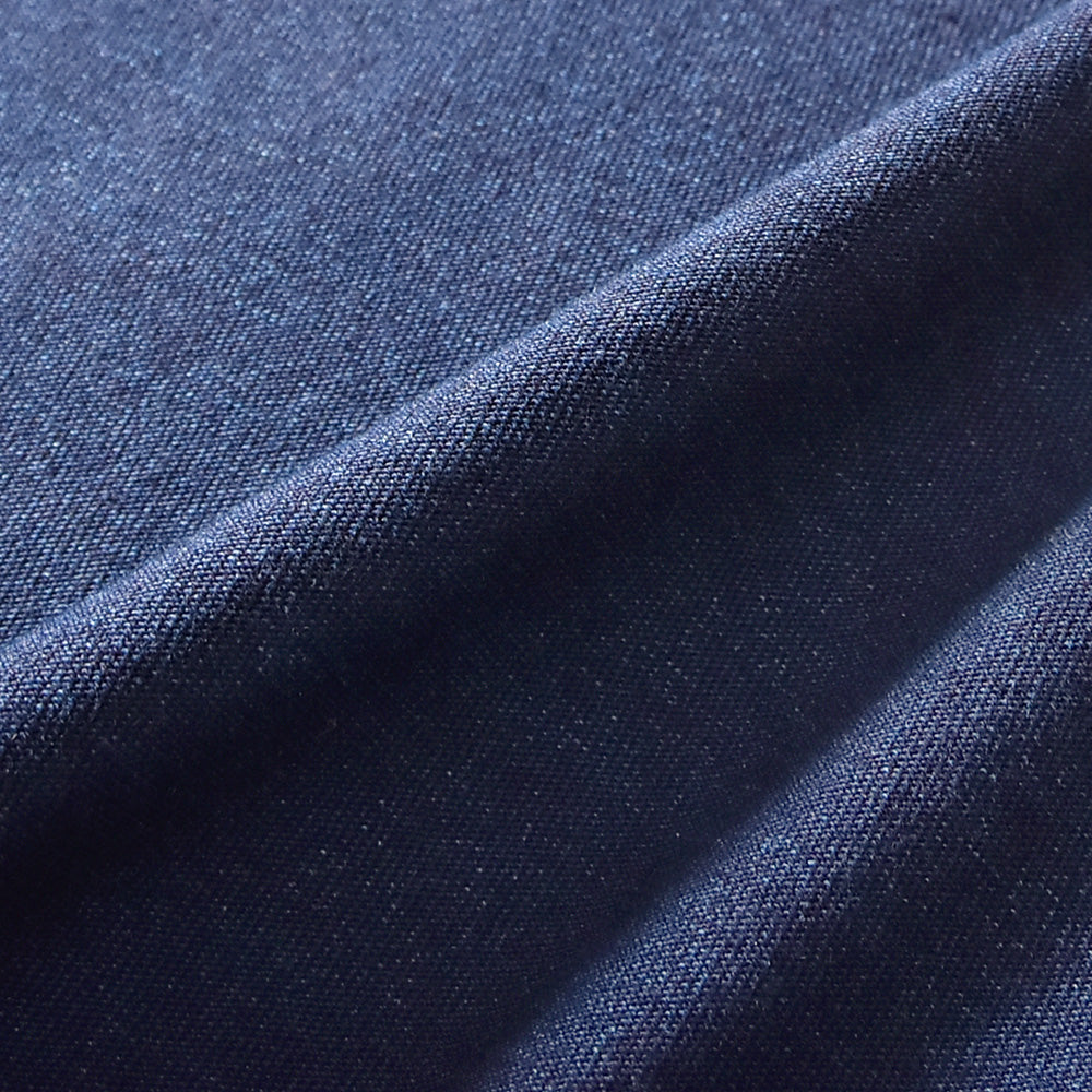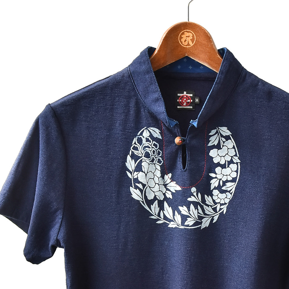 チャイナカラーのインディゴTシャツは、ウエストが少しシェイプされたきれいなシルエット。
