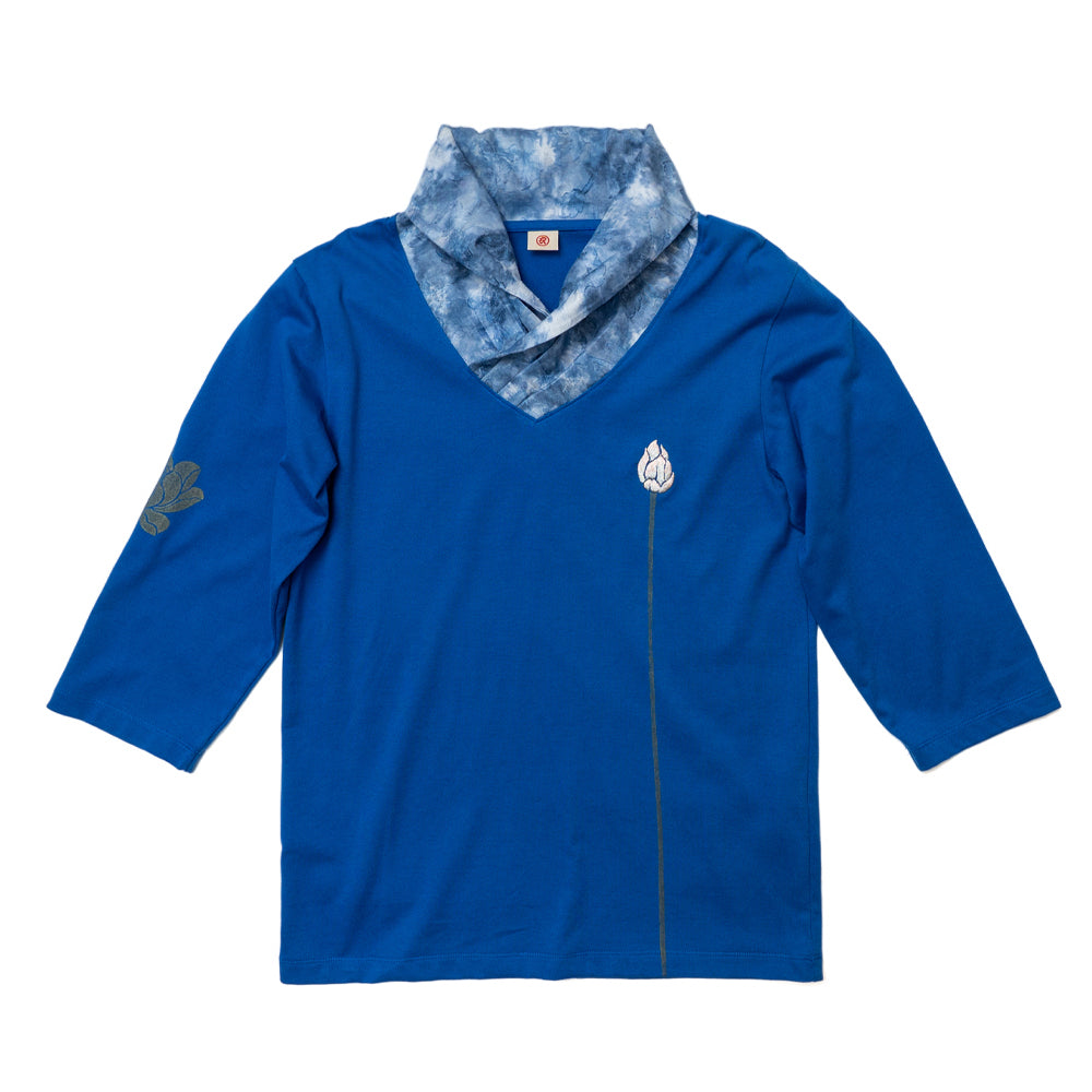プリントで入ってる蓮の蕾は金青(こんじょう)色をベースにし、ほの暗くて深く、そして朧(おぼろ)げな静けさを表現した色です。