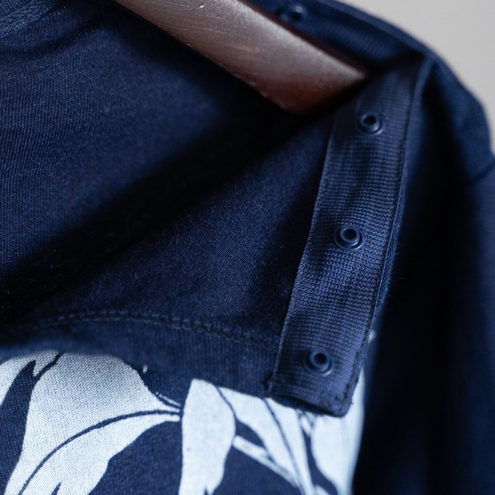 首元から袖にかけてテープスナップ釦仕様で開きやすく通常のネック部分より大きく開く為、腕を通しやすいよう一工夫された一枚。