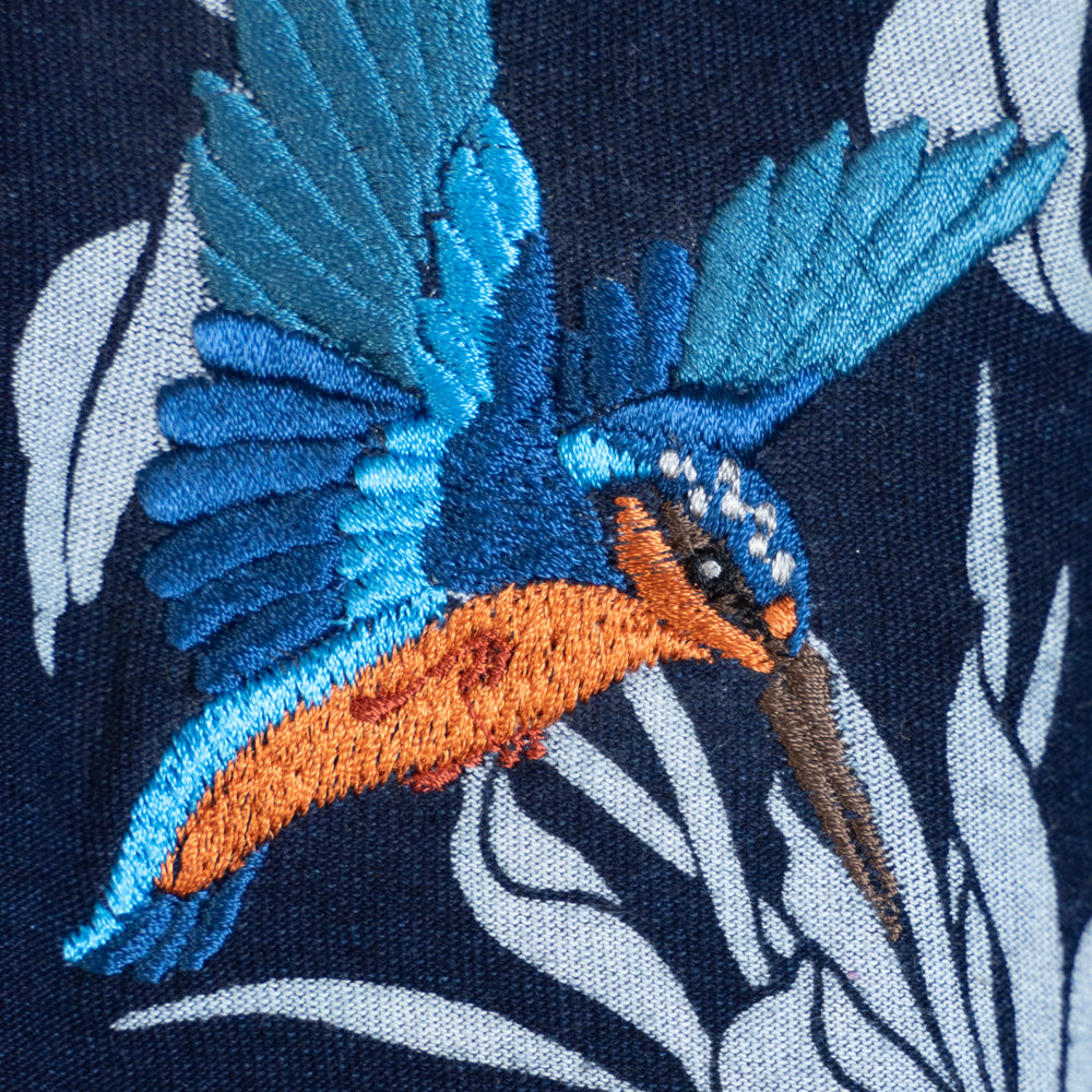 月の下、数時間だけ咲く儚い月下美人の花に翡翠(カワセミ)の刺繍を施しています。