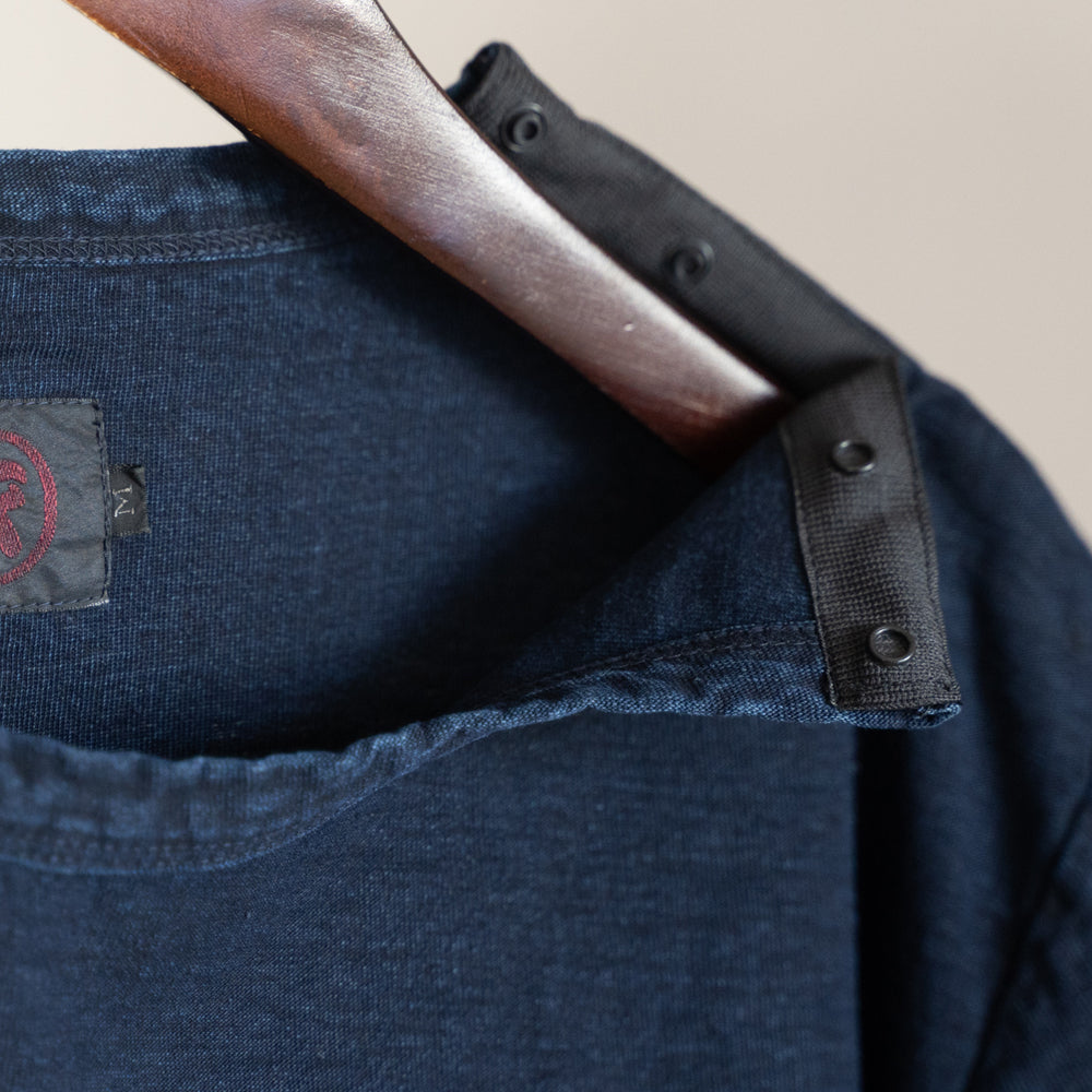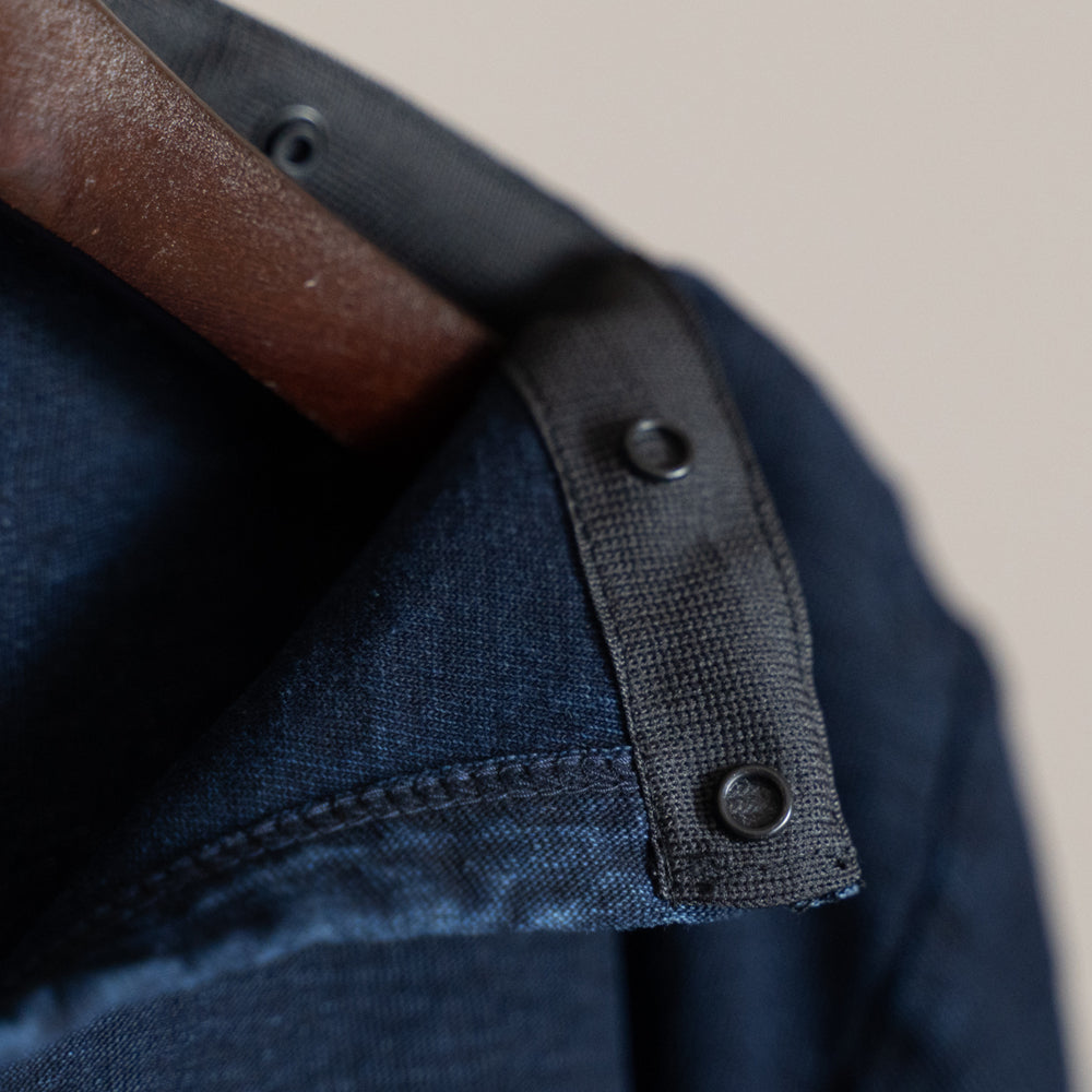 首元から袖にかけてテープスナップ釦仕様で開きやすく通常のネック部分より大きく開く為、腕を通しやすいよう一工夫された一枚。