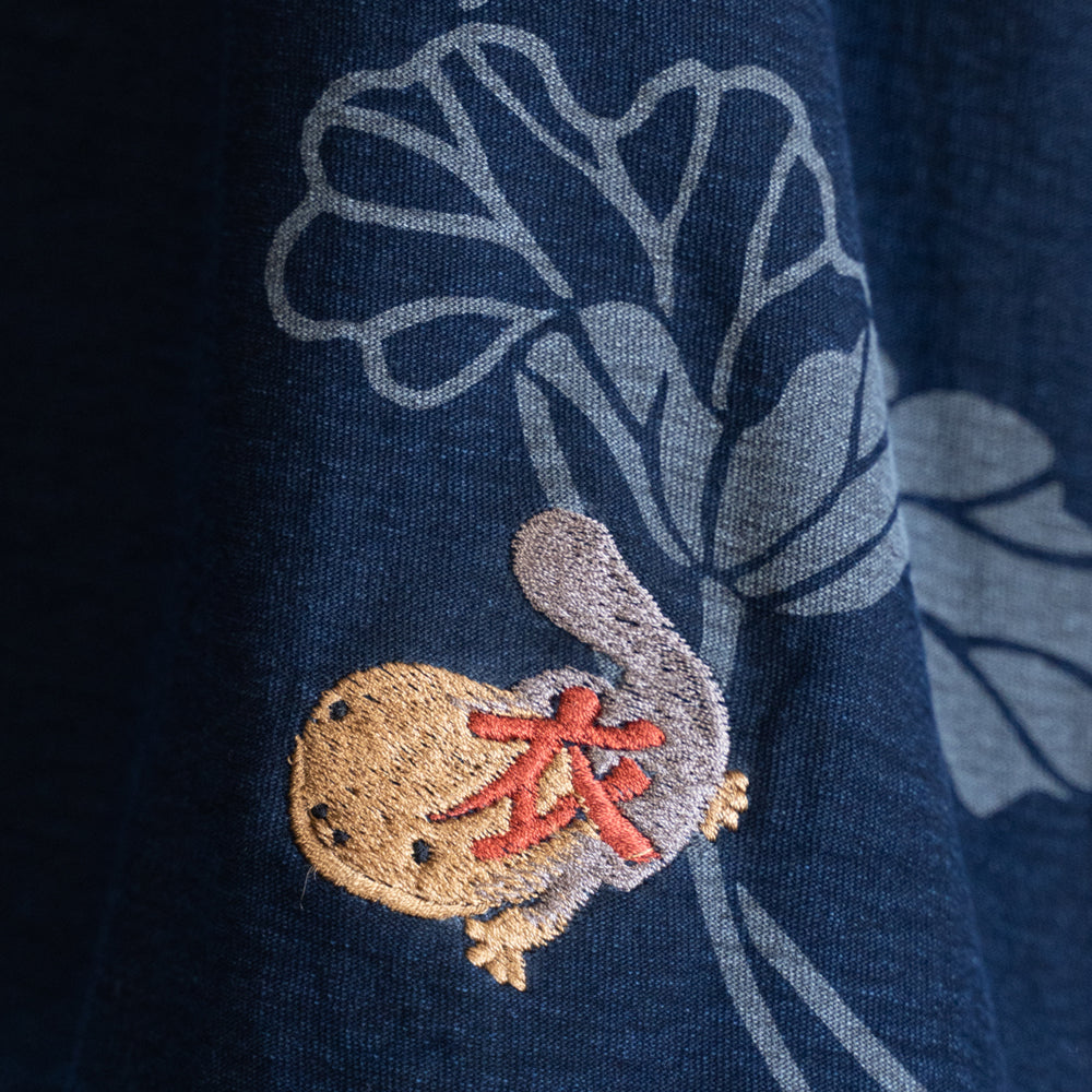 手振り刺繍職人による綺麗な刺繍に目がいくもよーく見ると小さなオオサンショウウオが佇んでいます。
